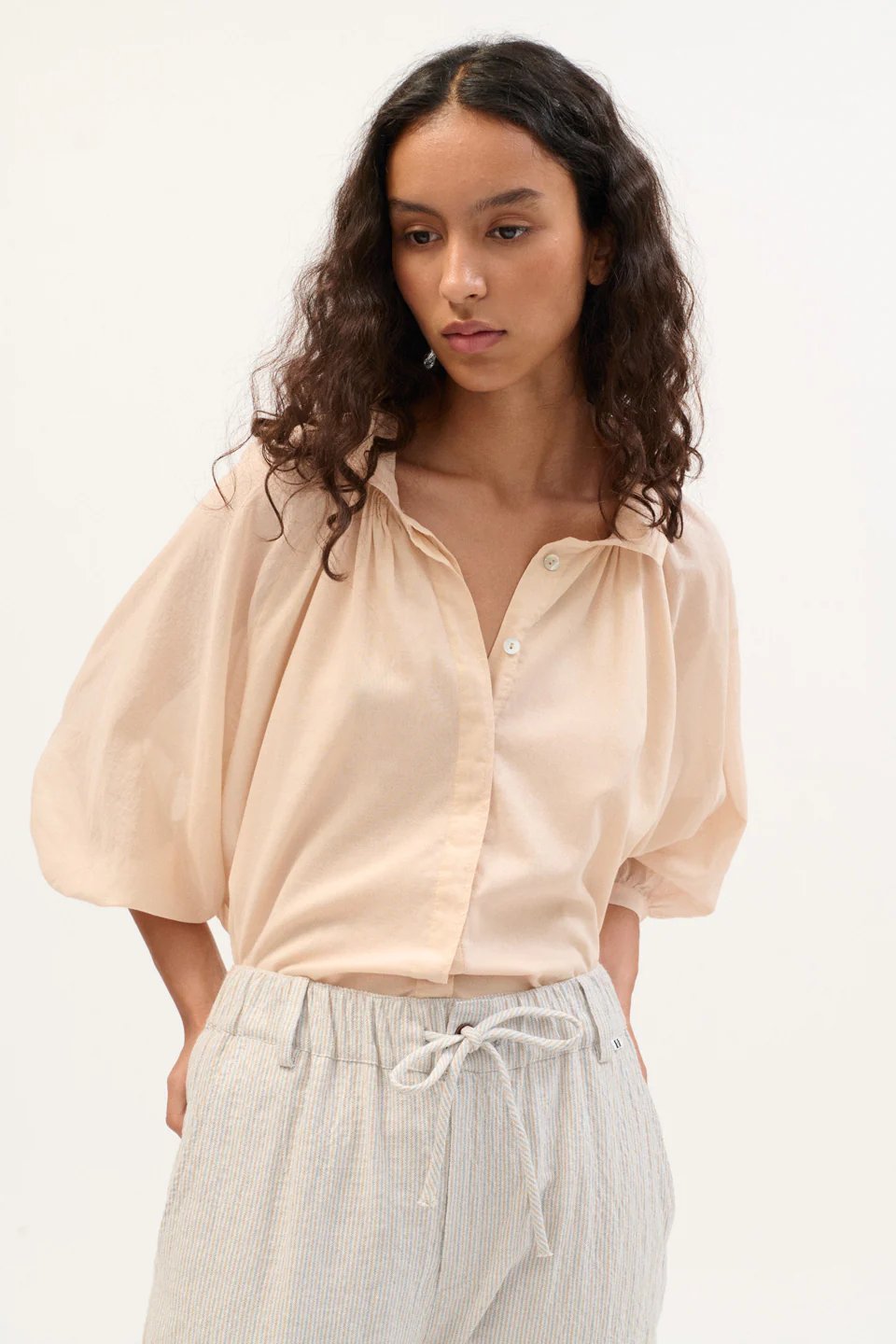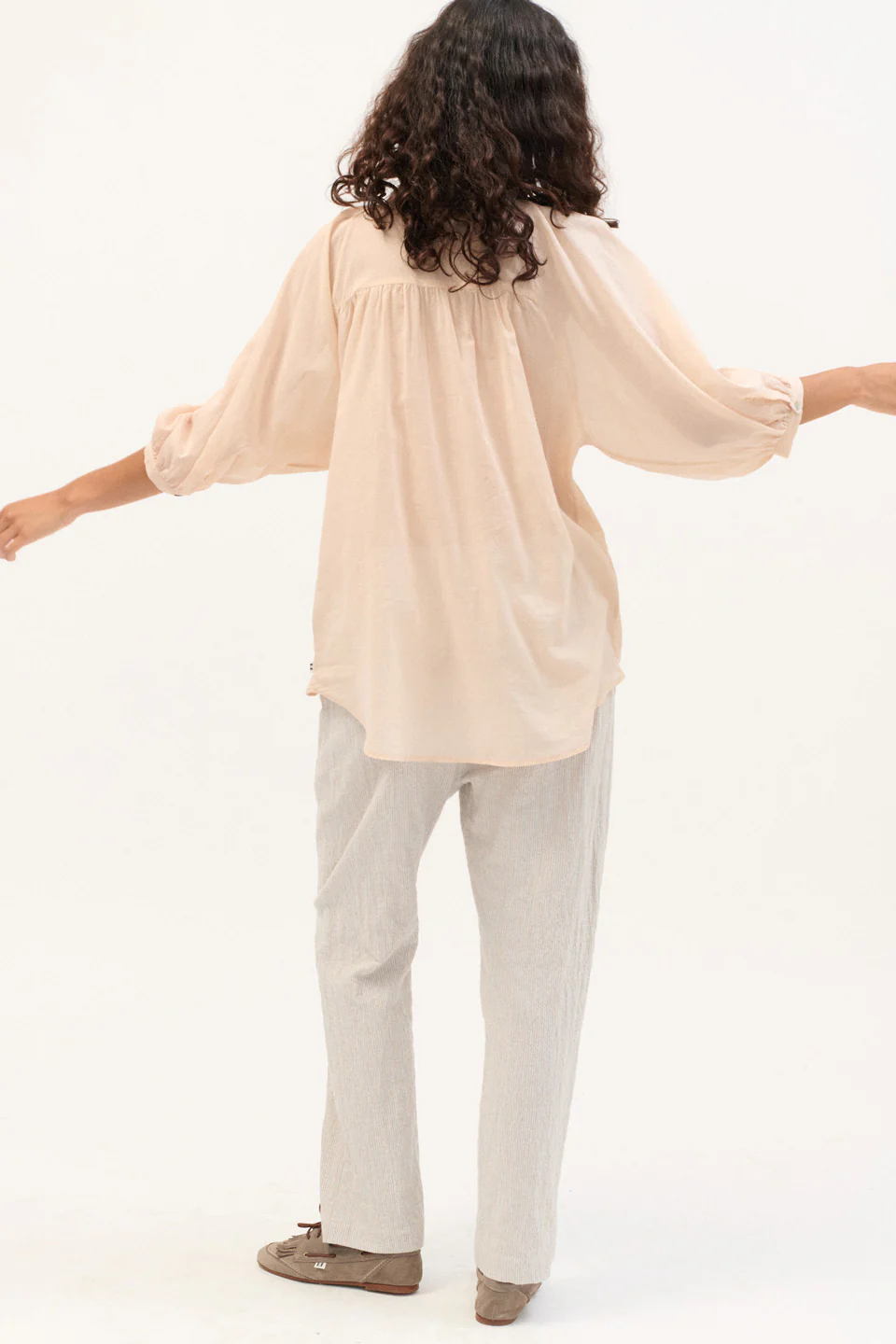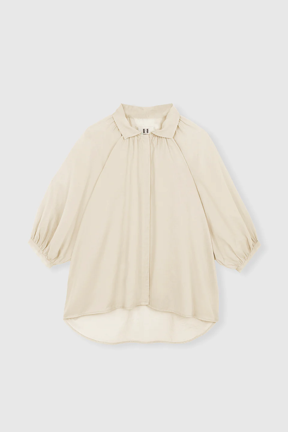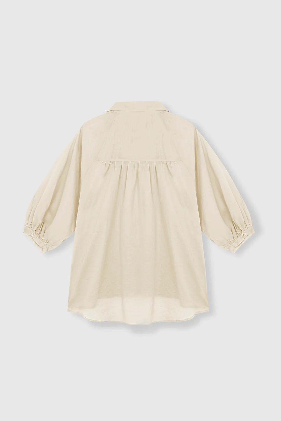 Camisa mussola de fit oversize. Manga tres cuartos abullonada, con frunces en hombros. Puño con frunces abotonado. Cuello italiano. Cierre delantero mediante botones. Canesú trasero con frunces.