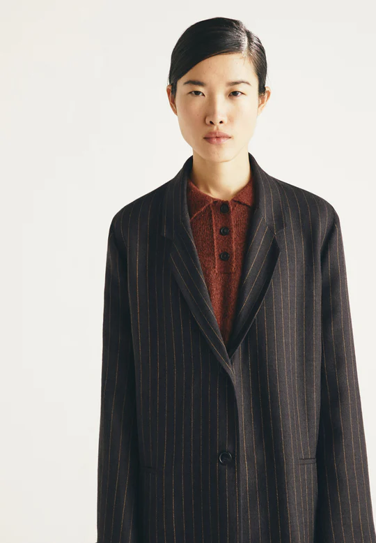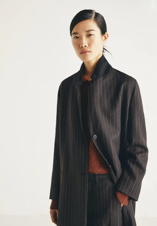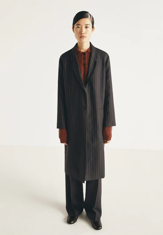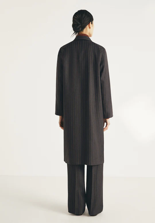 Abrigo de lana, con rayas diplomáticas. Cuello de solapa. Botonadura sencilla con dos botones en la parte delantera. Dos bolsillos laterales. Ajuste holgado. Longitud media.
