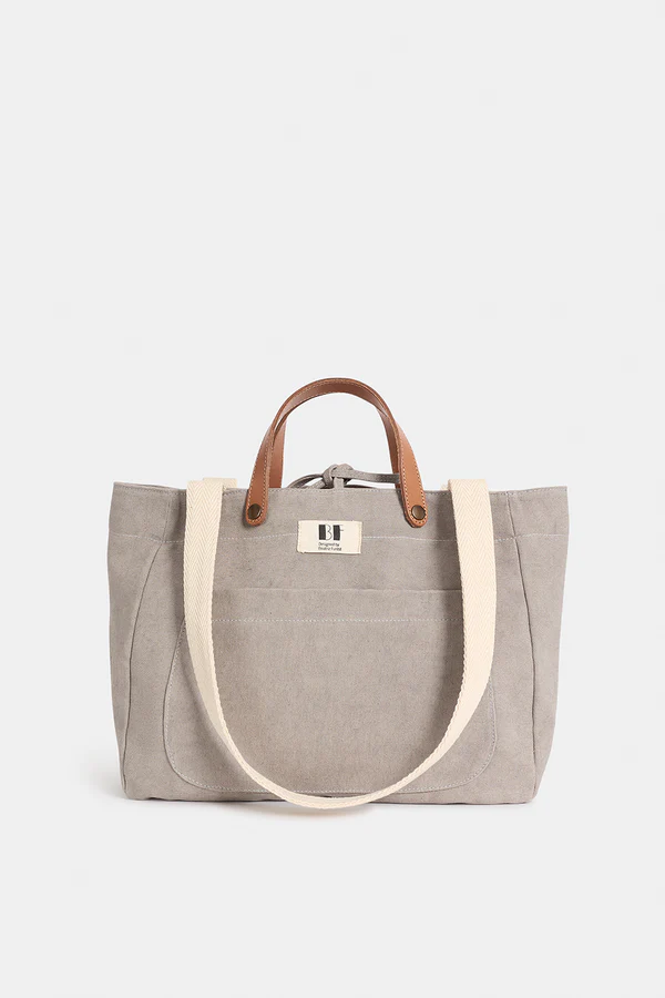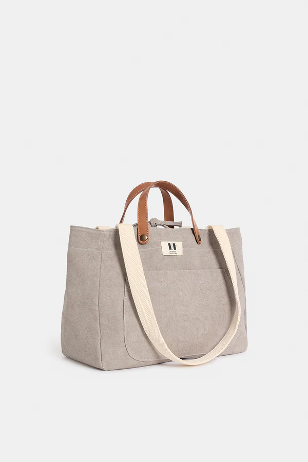 Bolso confeccionado en lona, de color gris claro con asa de color crudo.  100% algodón orgánico.  Asa de mano en piel vacuna. Asa bandolera regulable en algodón trenzado. Bolsillo interior que cierra con cremallera. Forro 100% de algodón.
