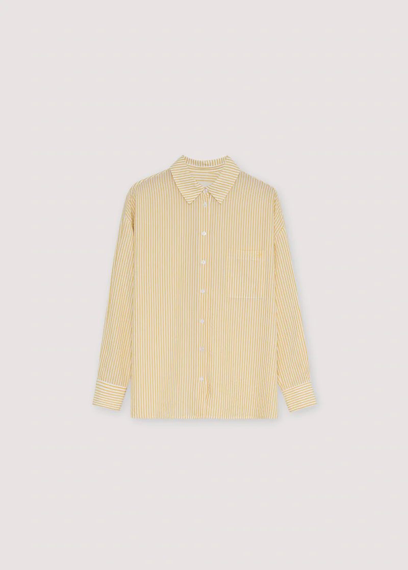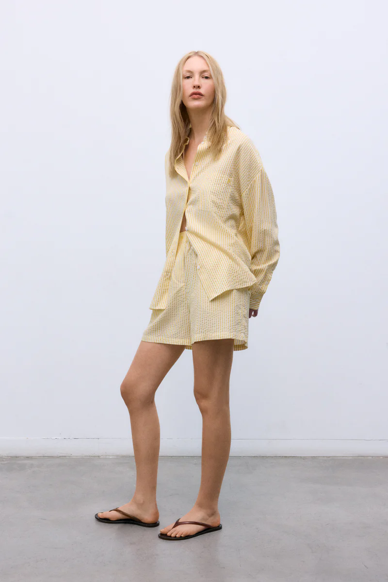 Camisa de manga larga de estilo relajado, con cuello clásico, cierre frontal con botones y un bolsillo en el pecho, con un sutil bordado de la marca. Una prenda versátil y ligera perfecta para la temporada e ideal para combinar con el pantalón corto a juego.