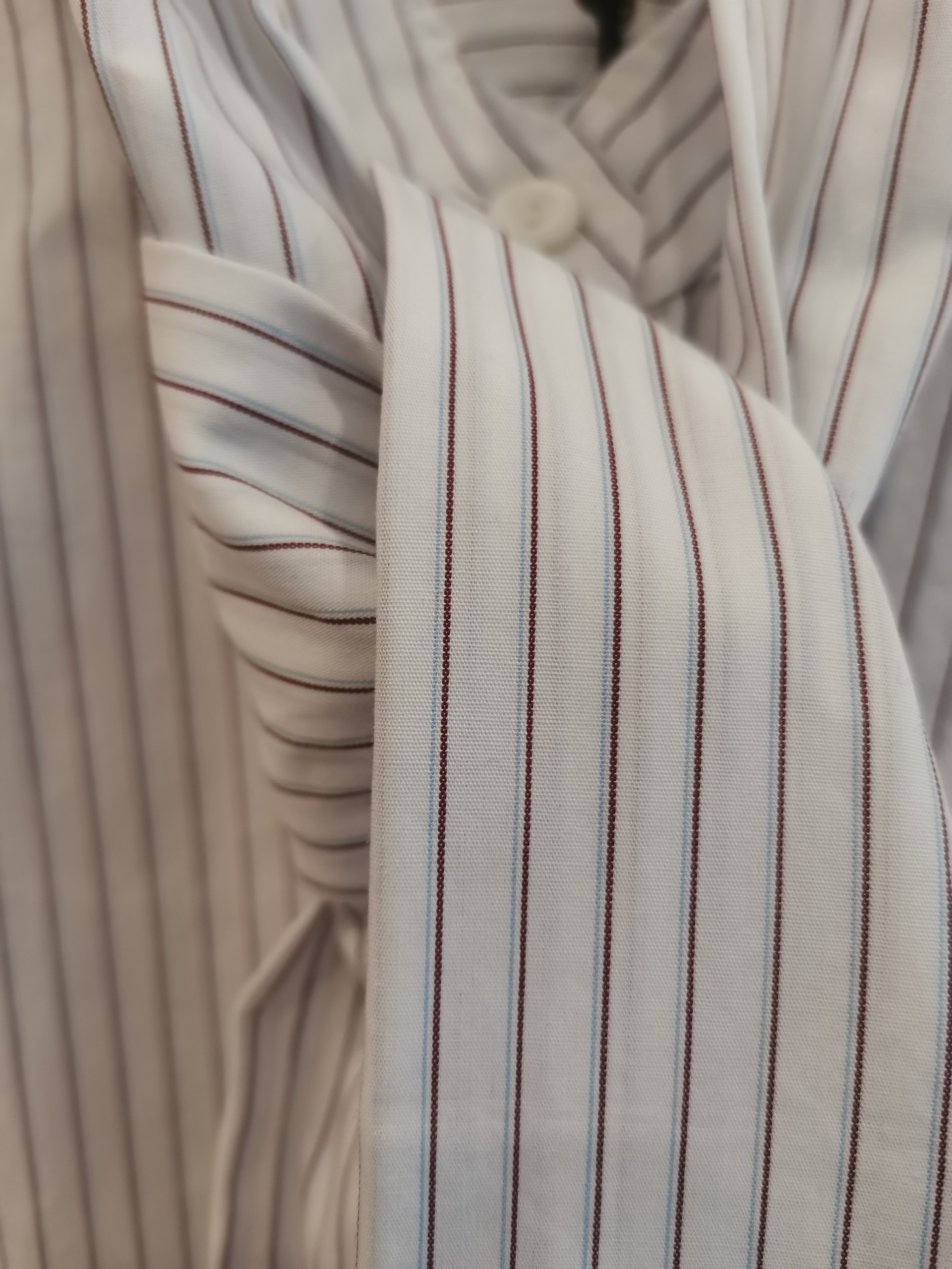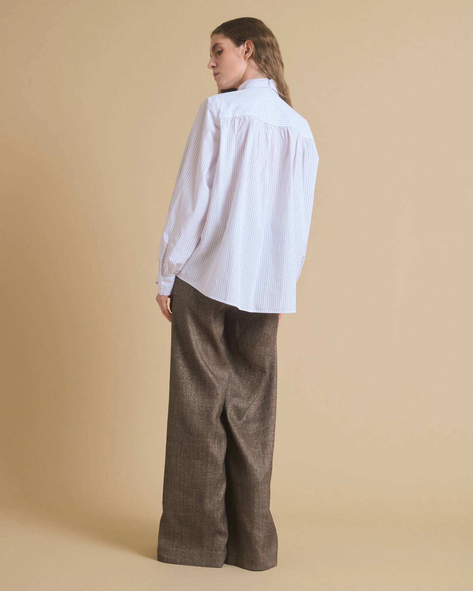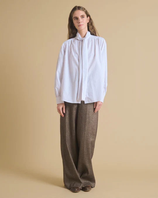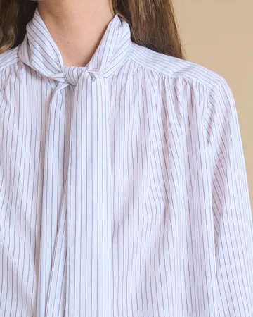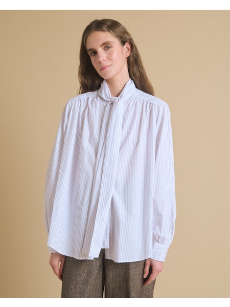 Camisa de algodón, con estampado de rayas. Cuello mao, con detalle de lazo extraíble. Manga larga.
