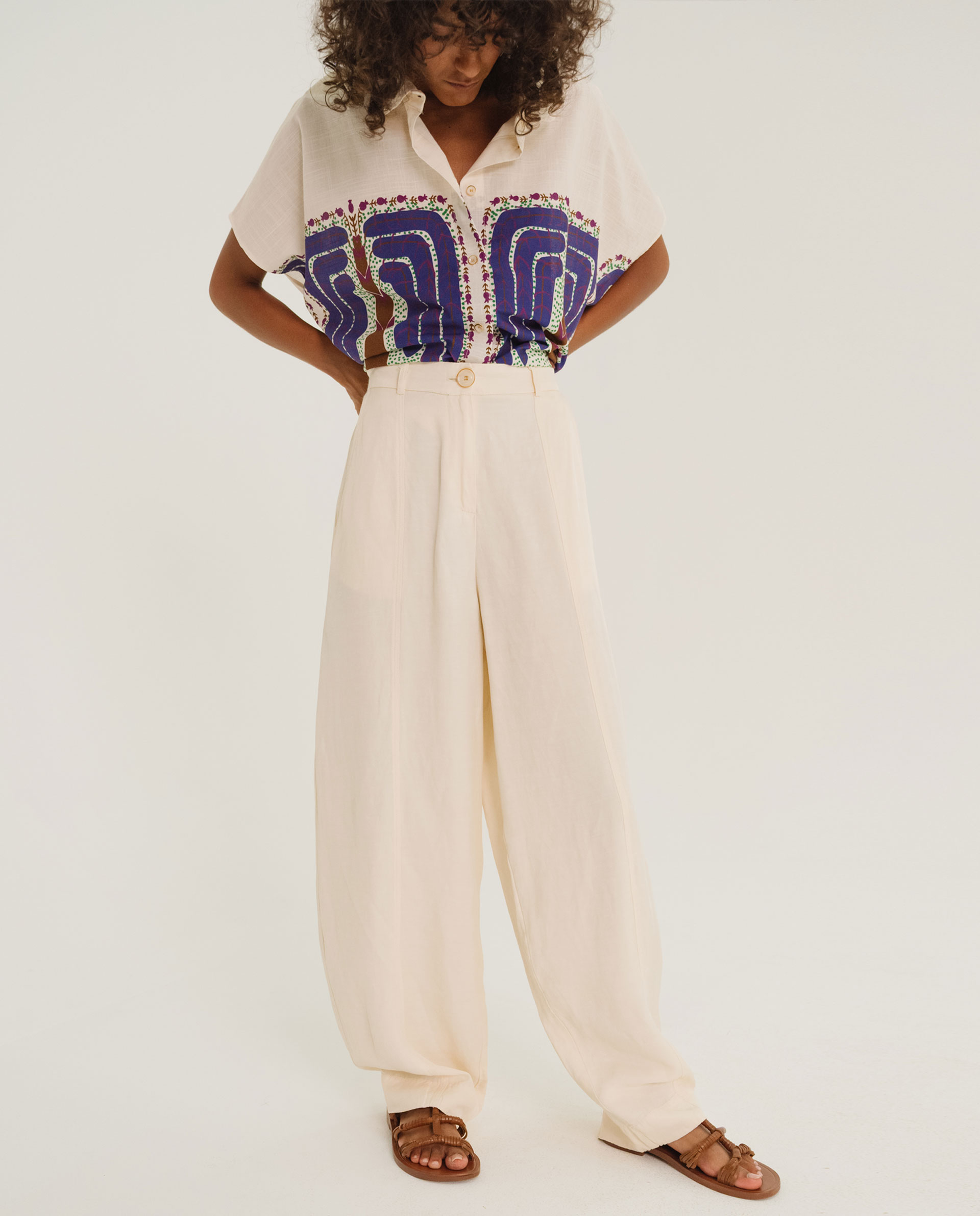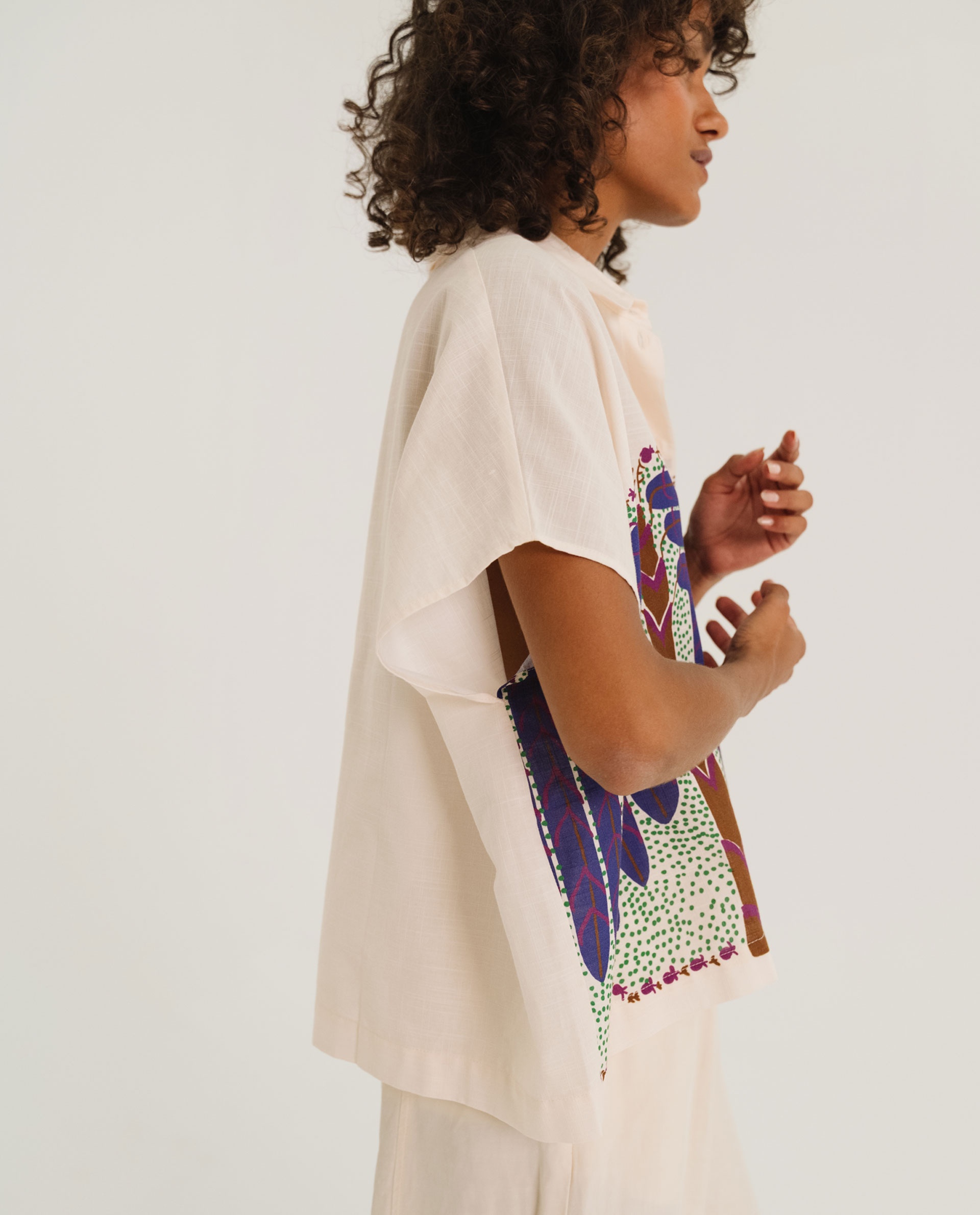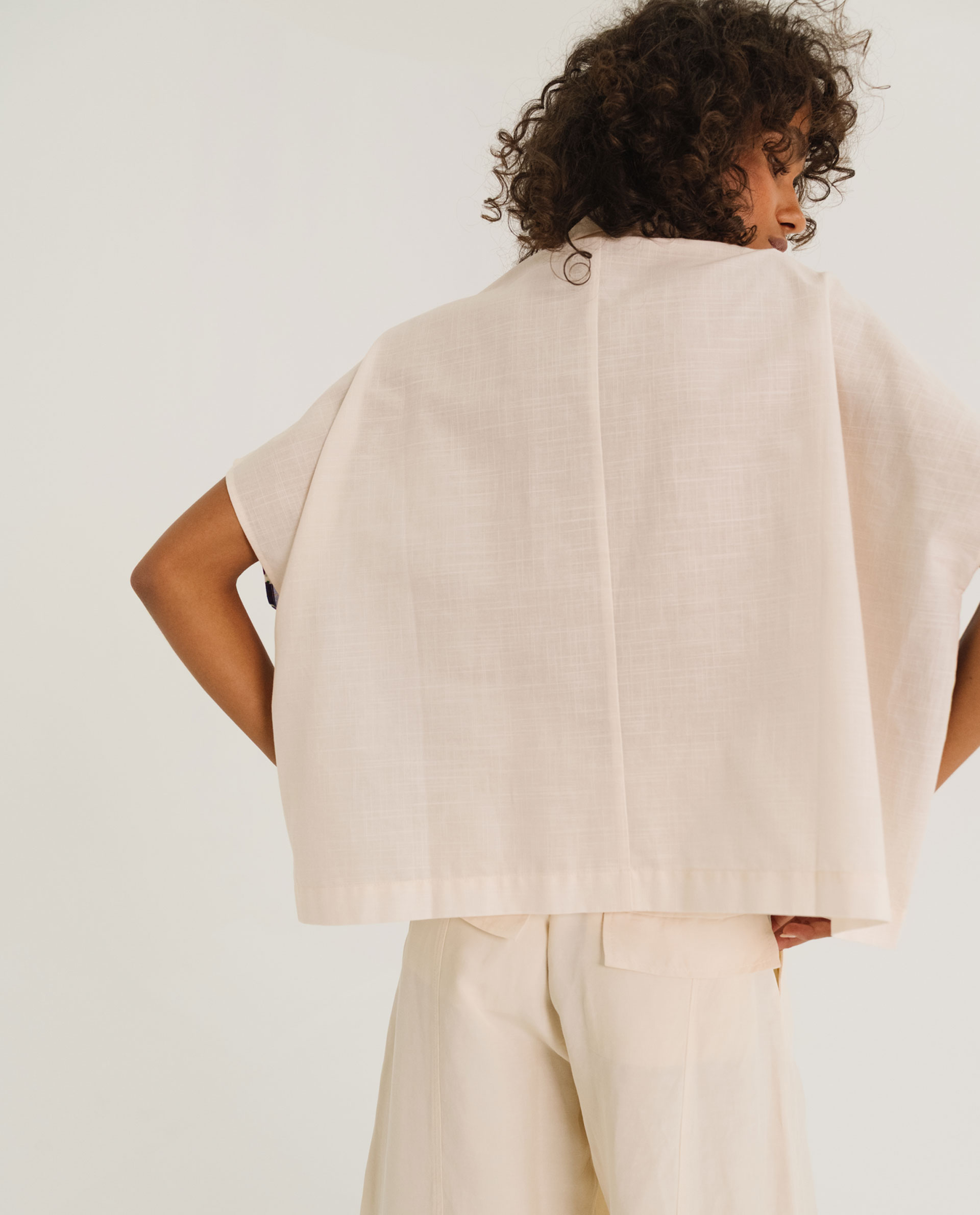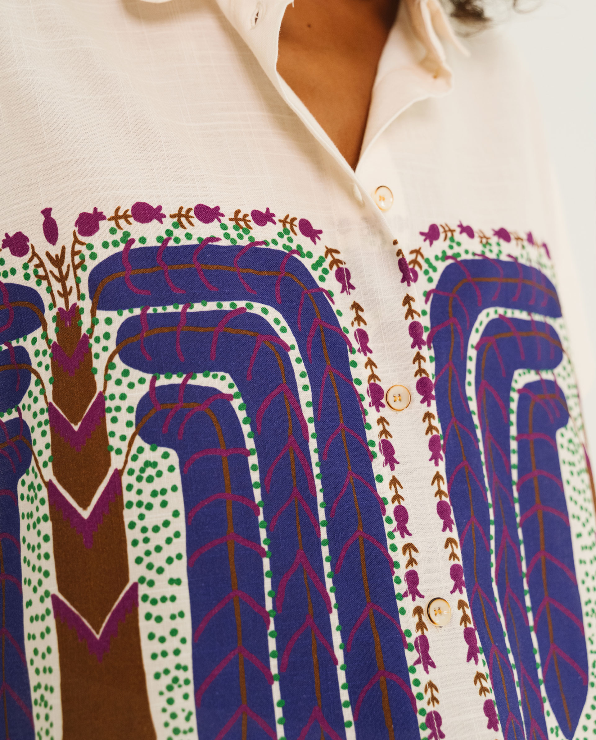 Camisa corta con volumen “Boxy”, con cuello de camisa redondeado, hombros caídos, que funcionan como mangas cortas. Cinzia está cortada en una tela de algodón flamé, impresa con un patrón exclusivo Tinsels.