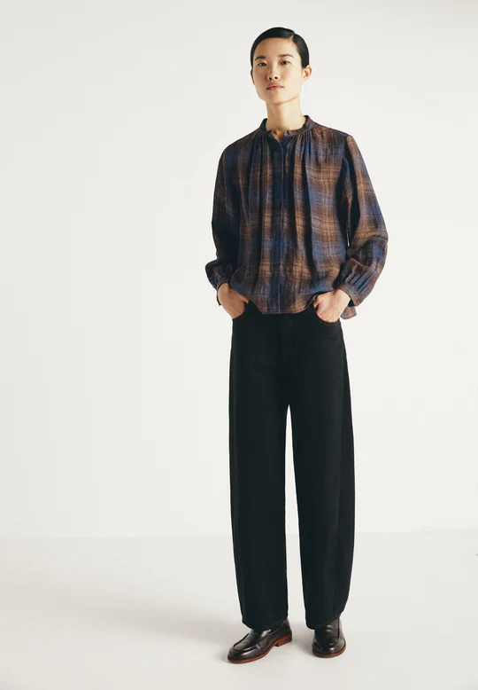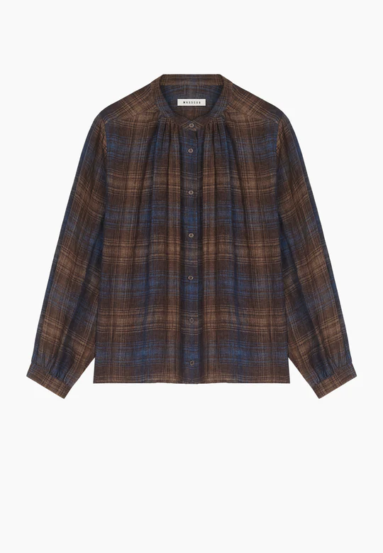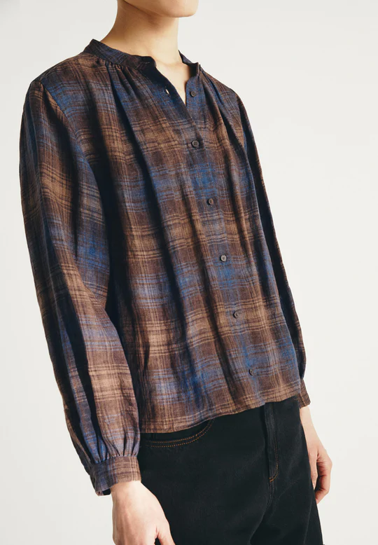 Camisa de cuadros de lino. Cuello mao. Cierre frontal con botones. Ajuste relajado y longitud regular. Manga larga.