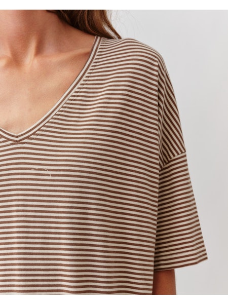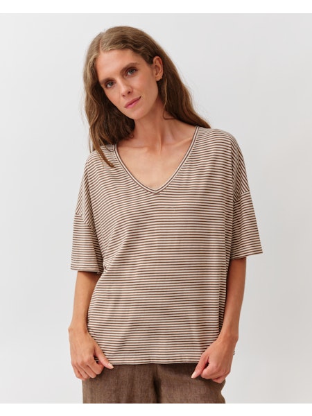 Camiseta de rayas, con escote en V y mangas cortas, ligeramente hombro caído. Su corte fluido, ofrece un aire natural, perfecto para un look casual y elegante a la vez.