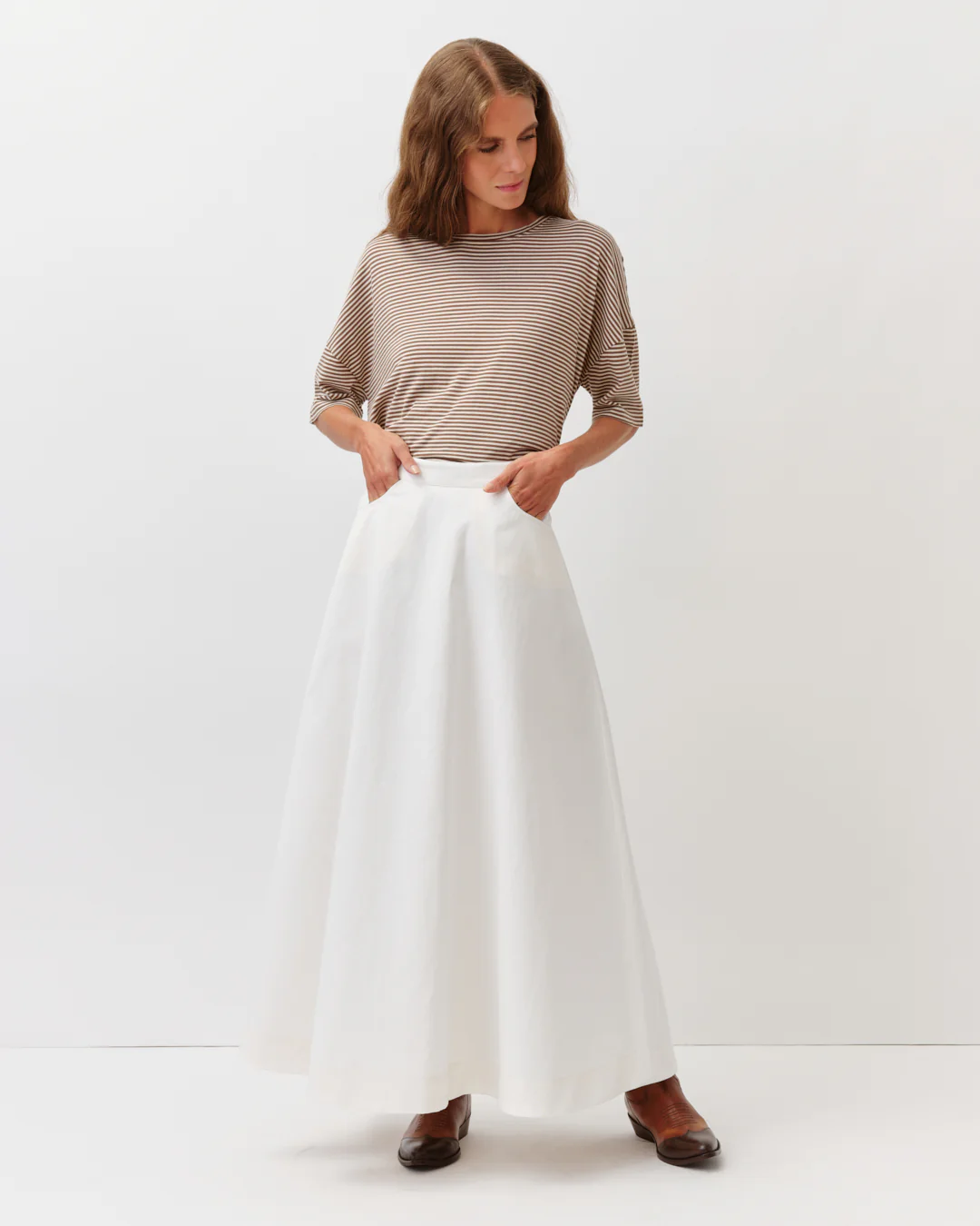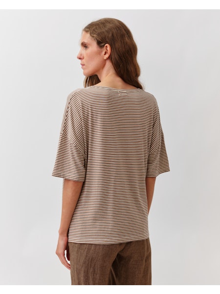 Camiseta de rayas, manga corta, color camel y cruda.