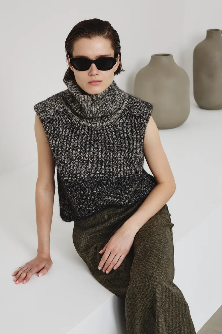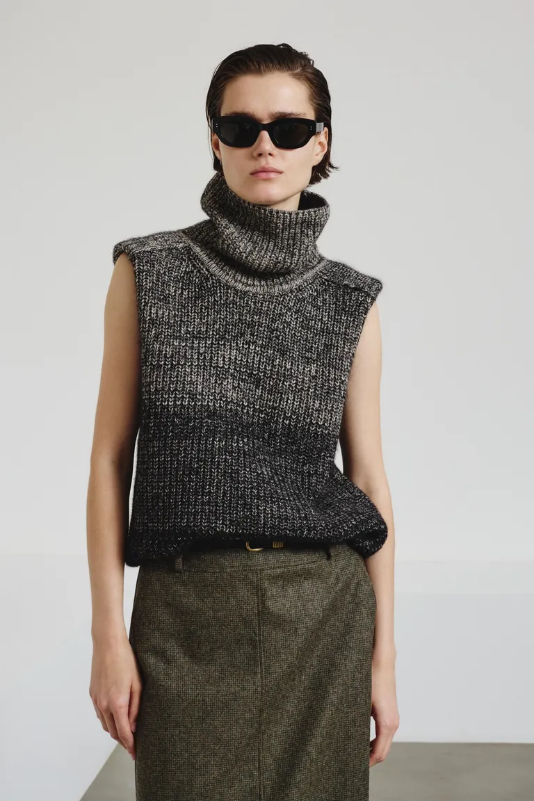 Suave y cálido, este chaleco de canalé inglés de cuello alto presenta un diseño cómodo y femenino. El cuello alto realza el aspecto envolvente de la prenda, complementando perfectamente la suavidad de la lana fina y el hilo de alpaca superfino. Un degradado de dos tonos.