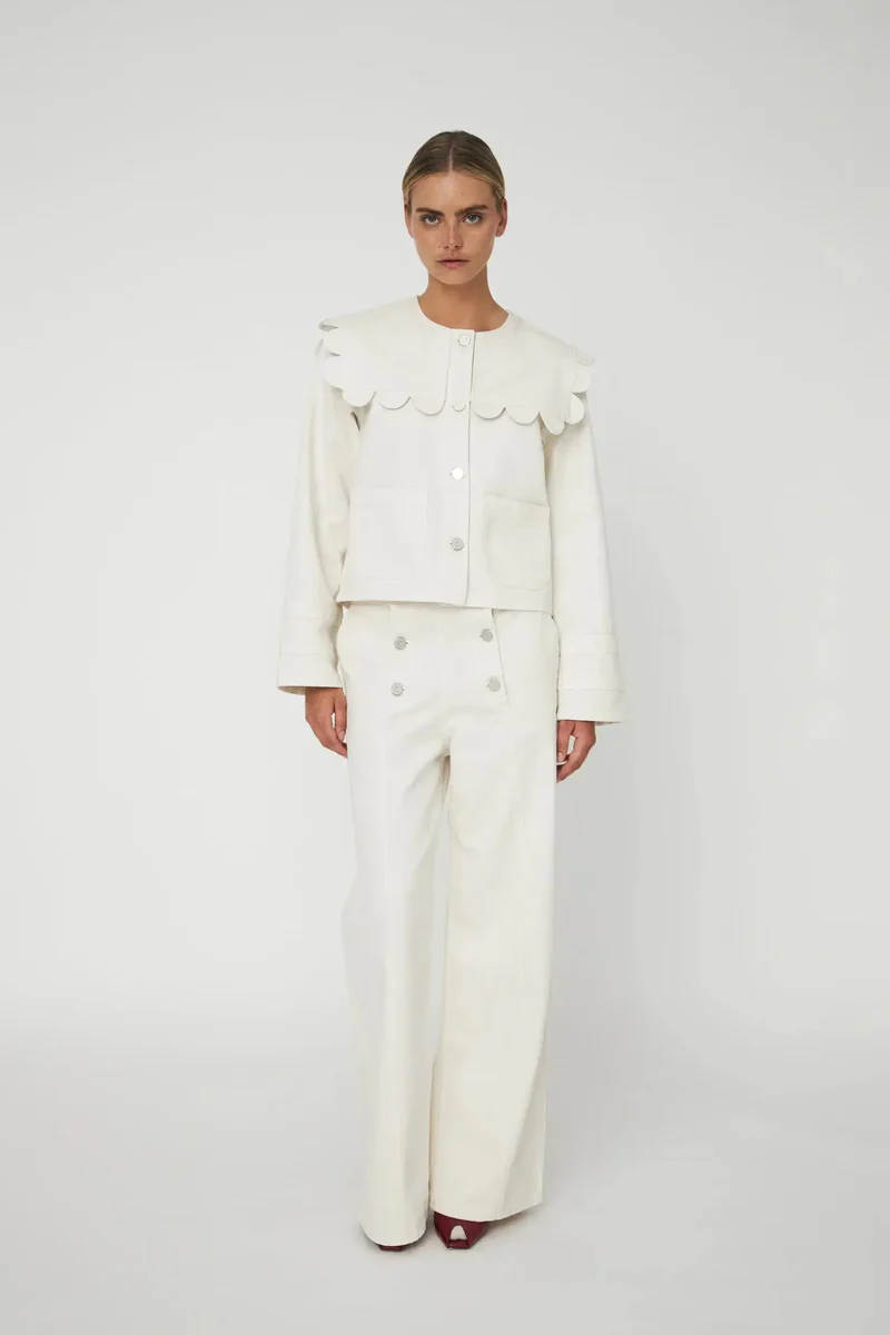 Chaqueta diseñada con cuello de inspiración marinera y cierre de botones en la parte delantera. Presenta mangas largas, bolsillos de parche frontales y un ajuste recto, ligeramente corto. Una etiqueta con el logo  en la parte superior de la espalda.