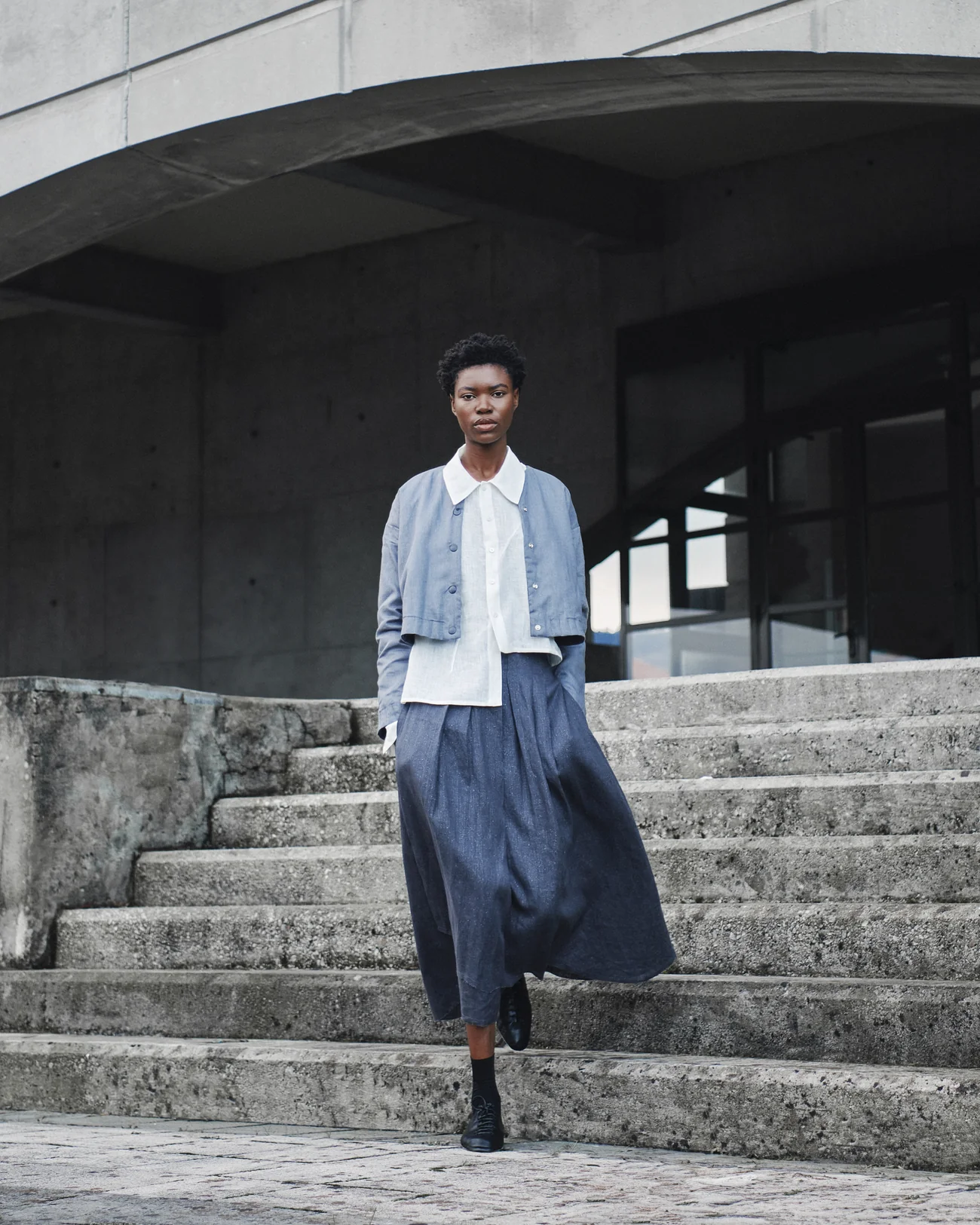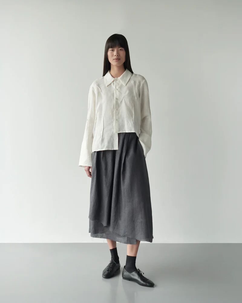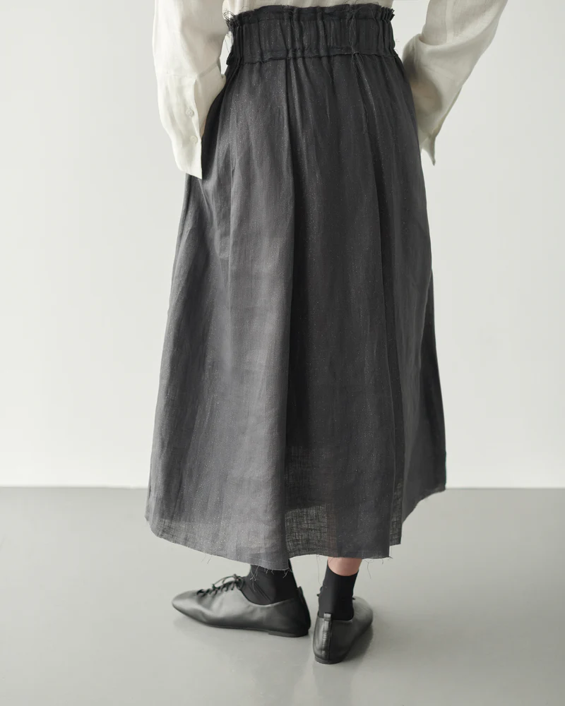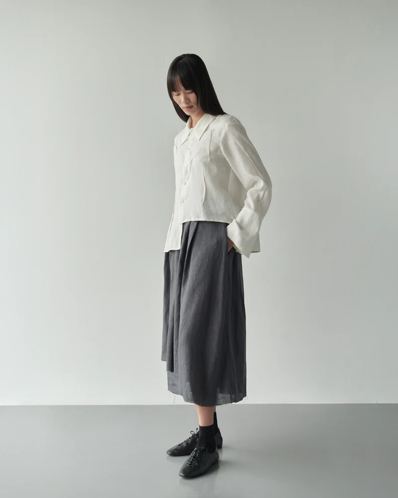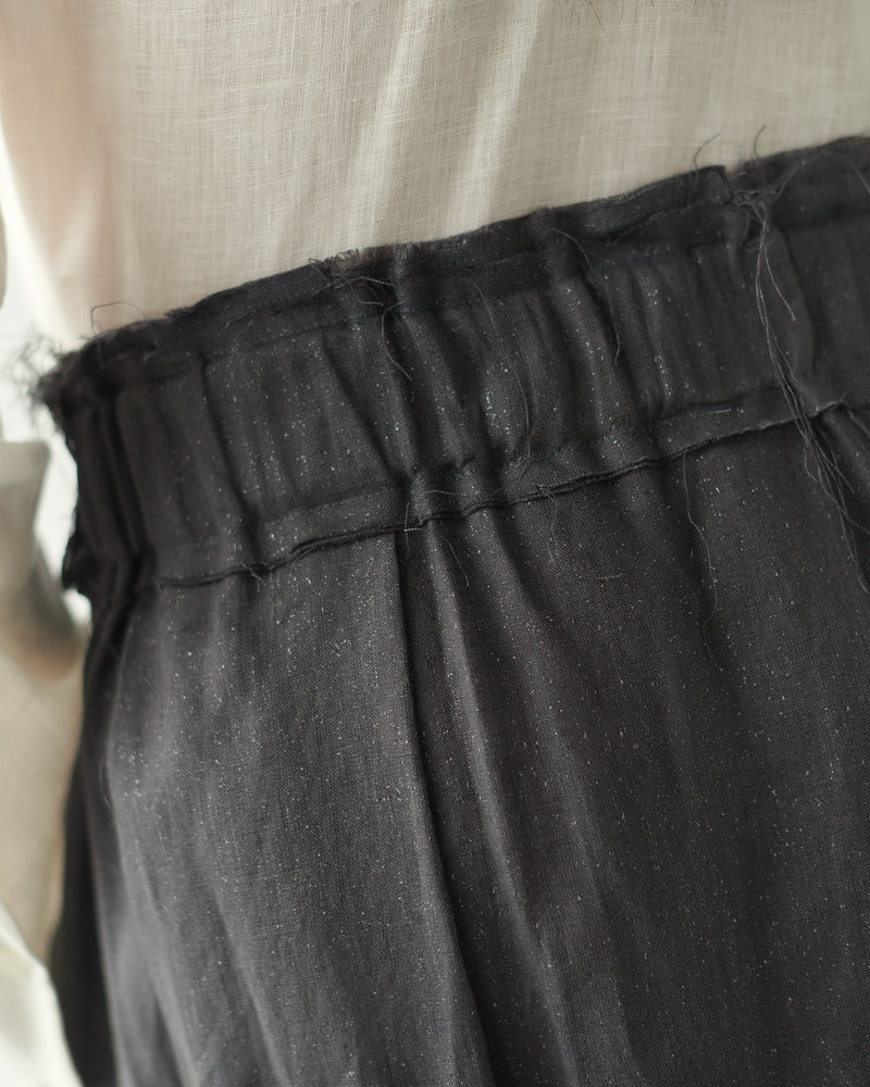 Falda cruzada con tablas en delantero. Fruncida con goma en la espalda. Bajo y cintura desflecado. Bolsillos laterales en costura.