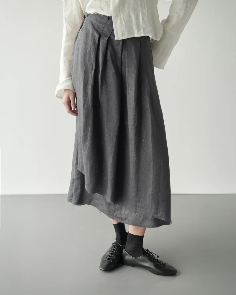 Falda cruzada con tablas en delantero, color gris, con sutil brillo.