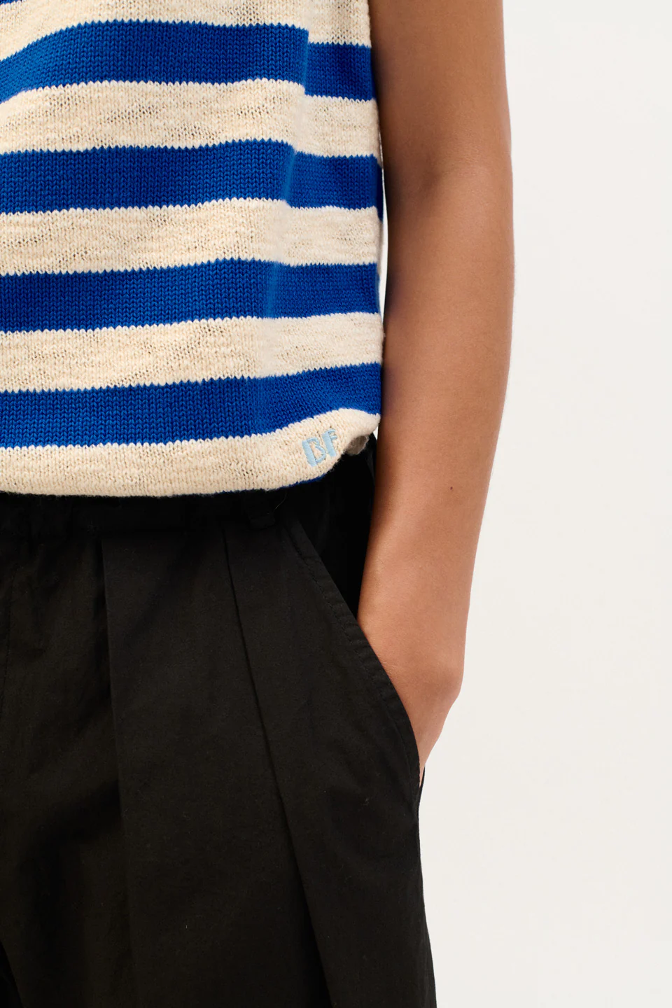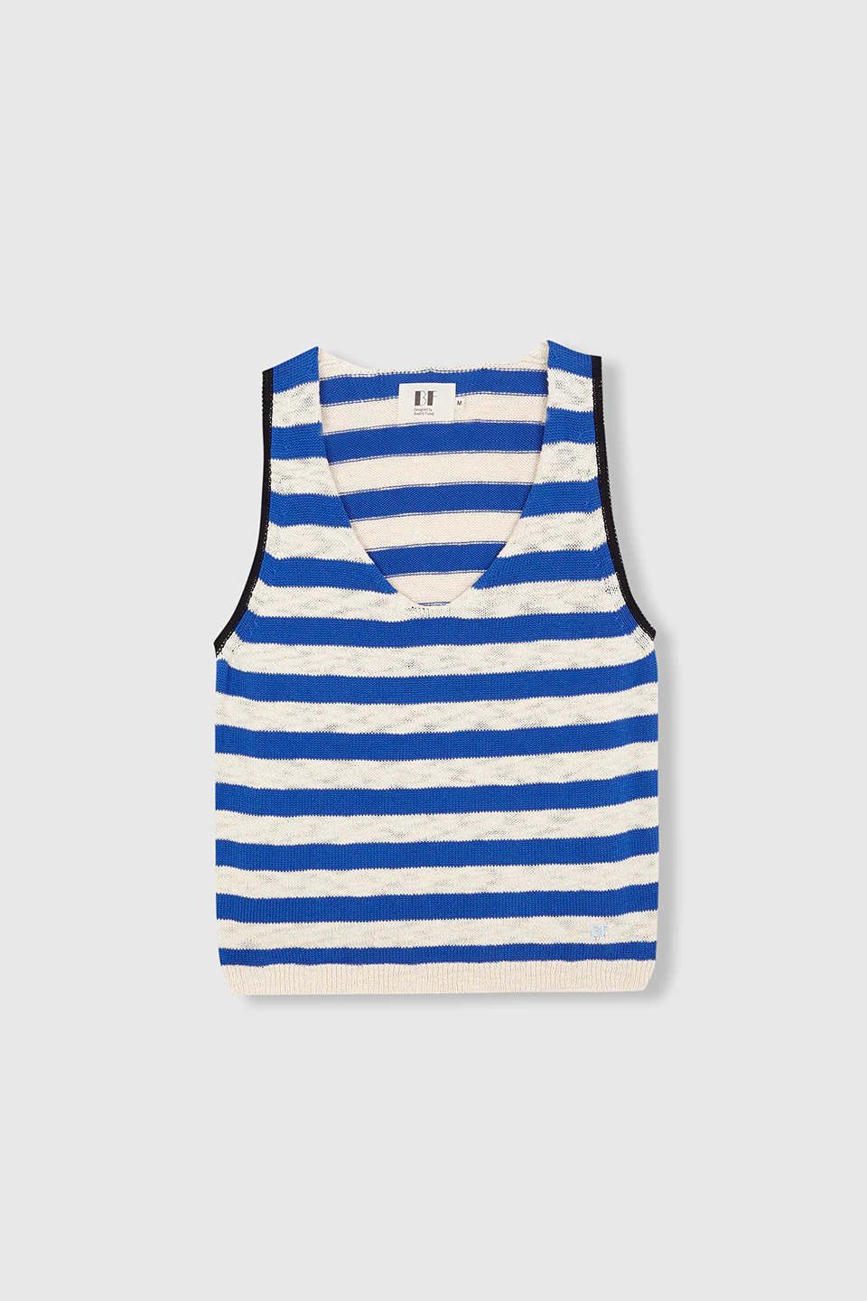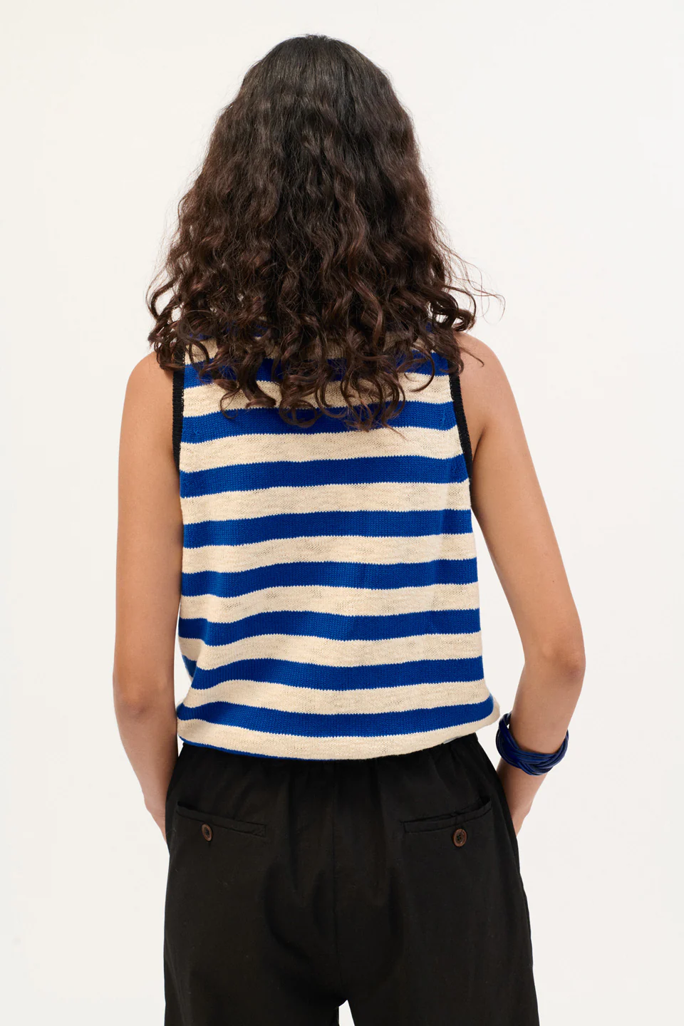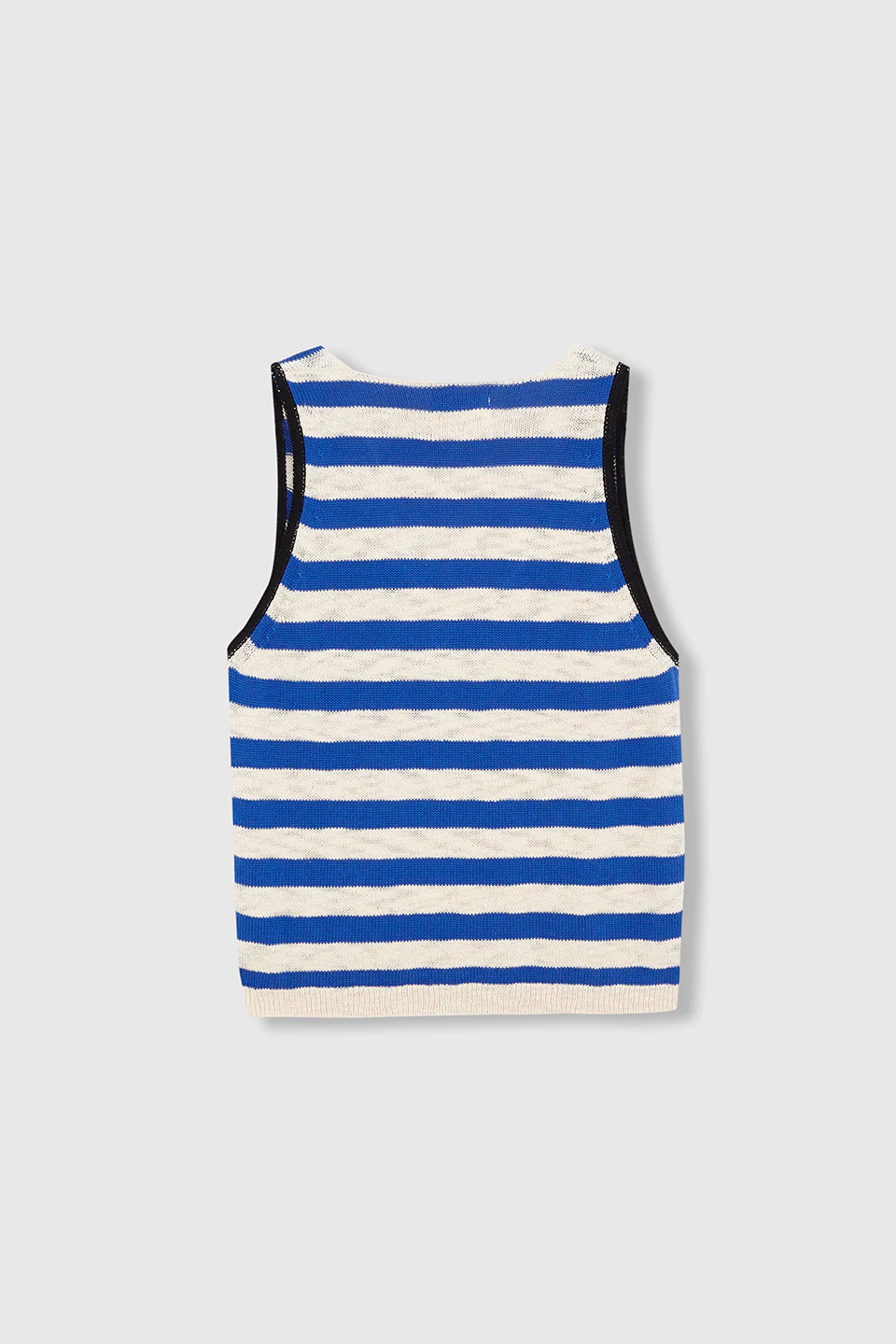 Jersey/Chaleco de tricot rústico en punto liso, de rayas, de fit regular. Cuello «U». Sin mangas, con vivo negro en sisas. Acabado con canalé en los bajos.