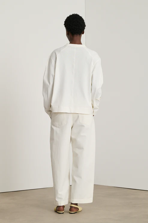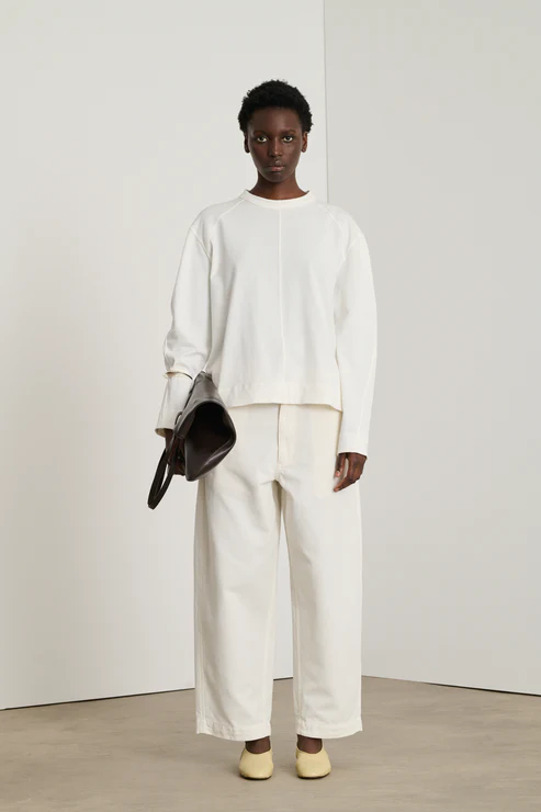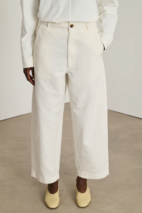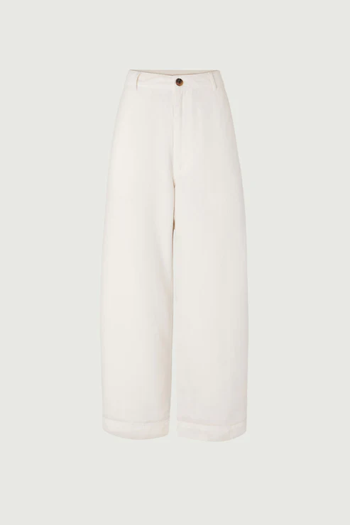 Pantalón ancho, corte globo, con volumen amplio, cintura baja. Corto, hasta los tobillos. Apertura con botones delanteros y bragueta. Dos bolsillos italianos en el frente y dos bolsillos aplicados en la parte trasera. Parche de cuero en la parte trasera.