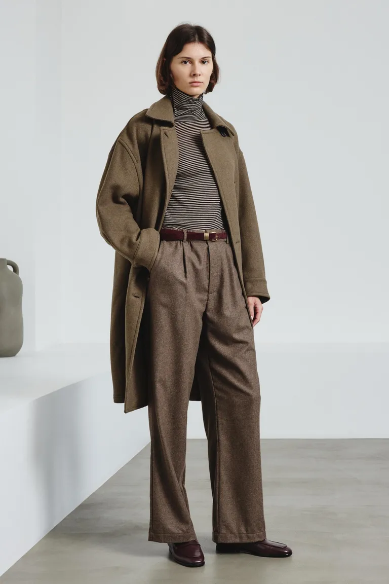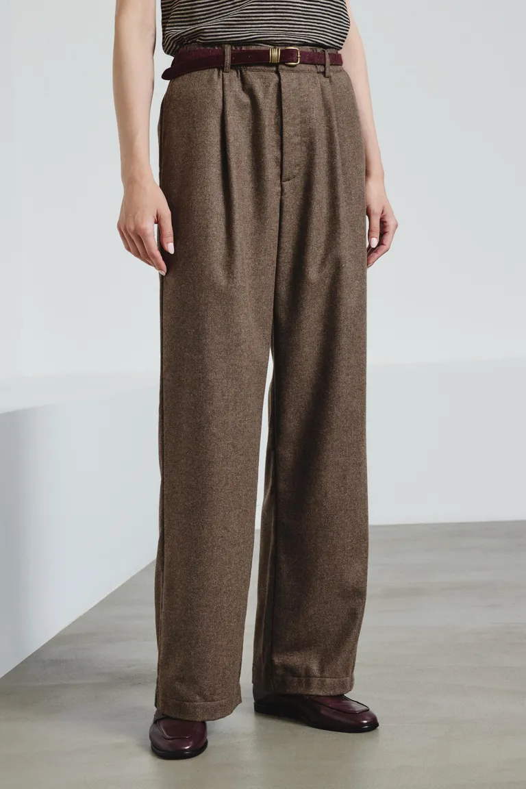 El atractivo informal de los pantalones de corte recto de viscosa y franela de lana,  se ve realzado por detalles de sastrería con bolsillos traseros ribeteados. El pliegue frontal profundo da forma a la silueta, que se extiende recta y ancha a lo largo de la pierna. La cintura elástica agrega un toque relajado, creando un equilibrio perfecto entre comodidad y estilo.