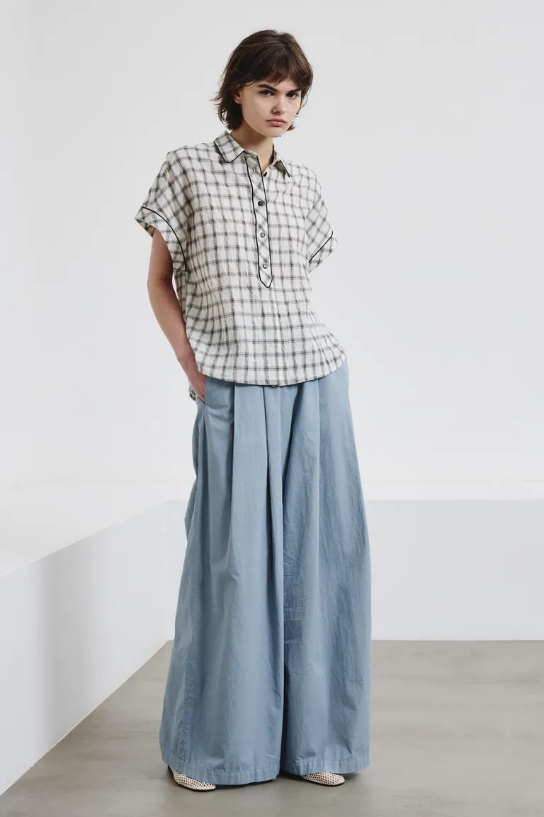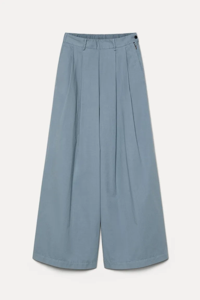 Los volúmenes anchos y fluidos de los pantalones, realzan la textura ligera y casual de la gabardina de algodón. Doble pliegue frontal. Bolsillos laterales. Cintura elástica en la espalda. Trabillas para cinturón. Cierre en un lateral con botón y cremallera oculta.