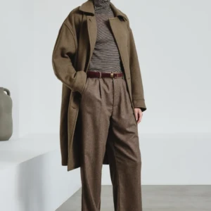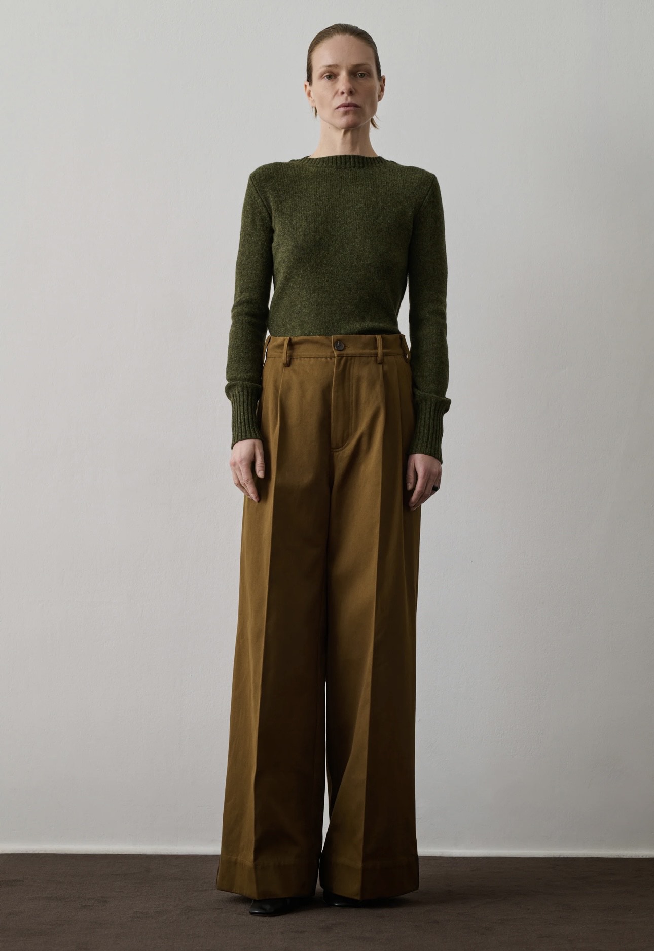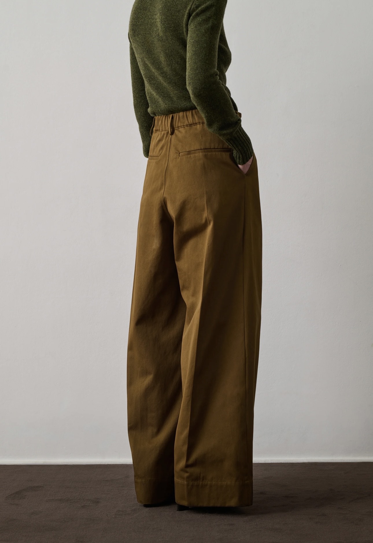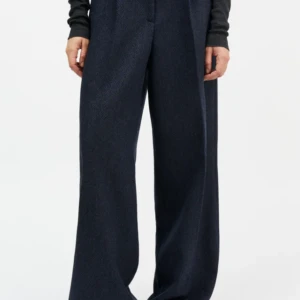 Pantalón de pinzas en sarga de algodón. Talle entallado y piernas anchas. Cintura elástica en la parte posterior. Abertura con botones y cremallera. Dos bolsillos italianos delante y dos bolsillos de ojal en la parte posterior. Pliegues marcados a lo largo de la pierna delante y detrás. Sarga de algodón gruesa.