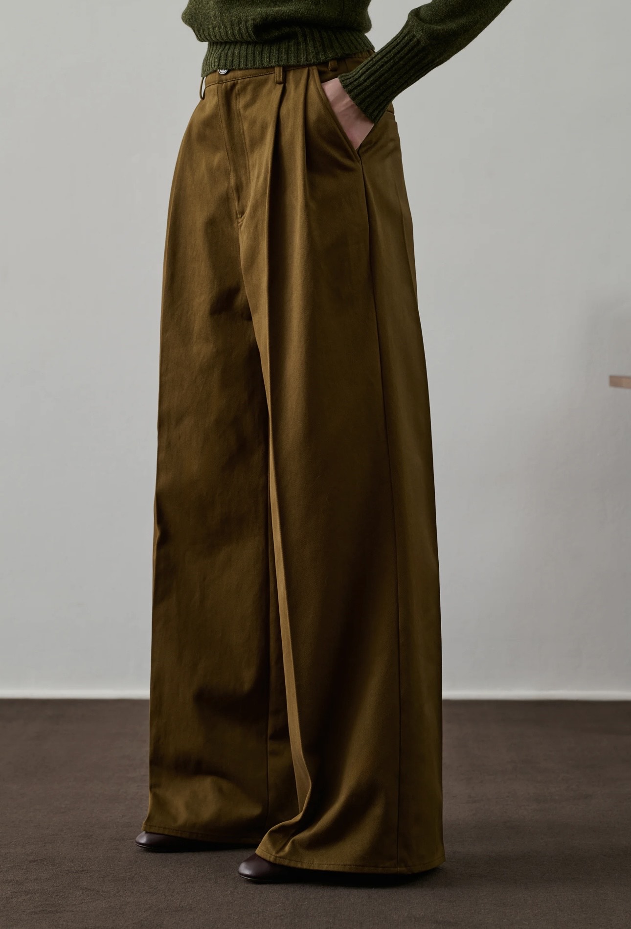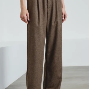 Pantalón de pinzas en sarga de algodón, color bronce.