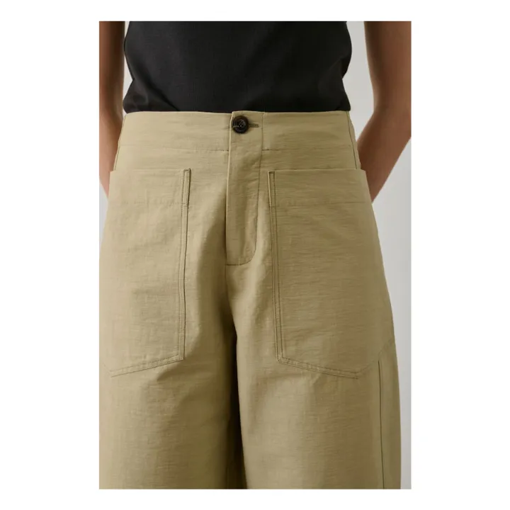 Pantalón de corte amplio, perneras ligeramente redondeadas. Cierre con botón y cremallera.  Dos bolsillos grandes de parche en la parte delantera y ribeteados en la trasera.  Popelina flameada de algodón y poliamida.