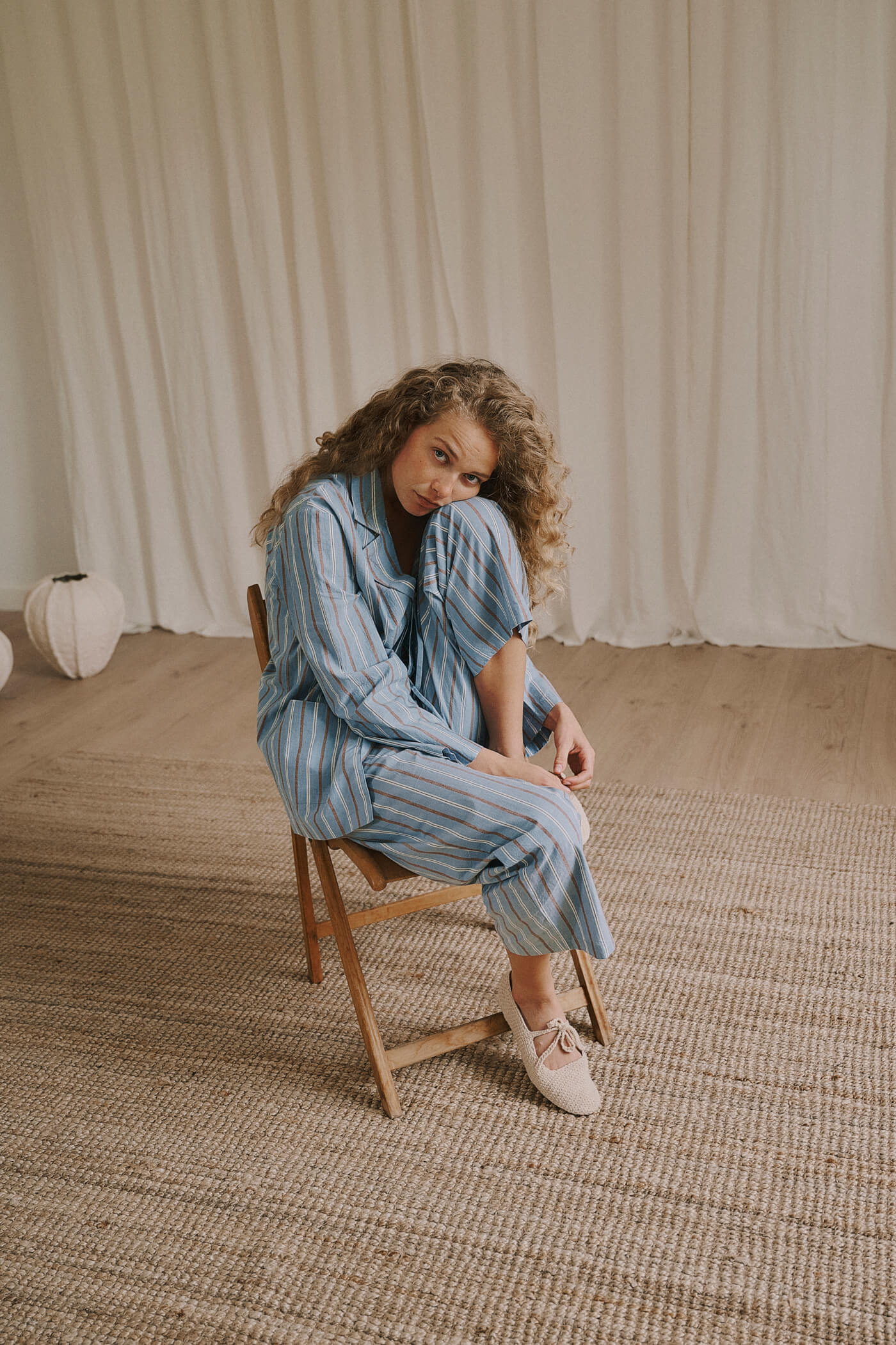 Pantalón de algodón a rayas, de estilo relajado, holgado, con cintura elástica y cordón ajustable. Bolsillos laterales.