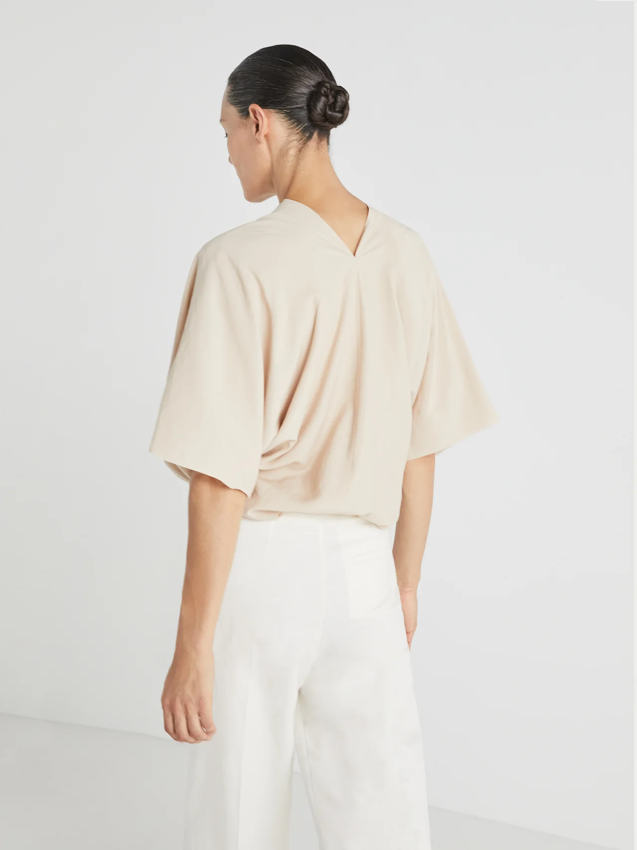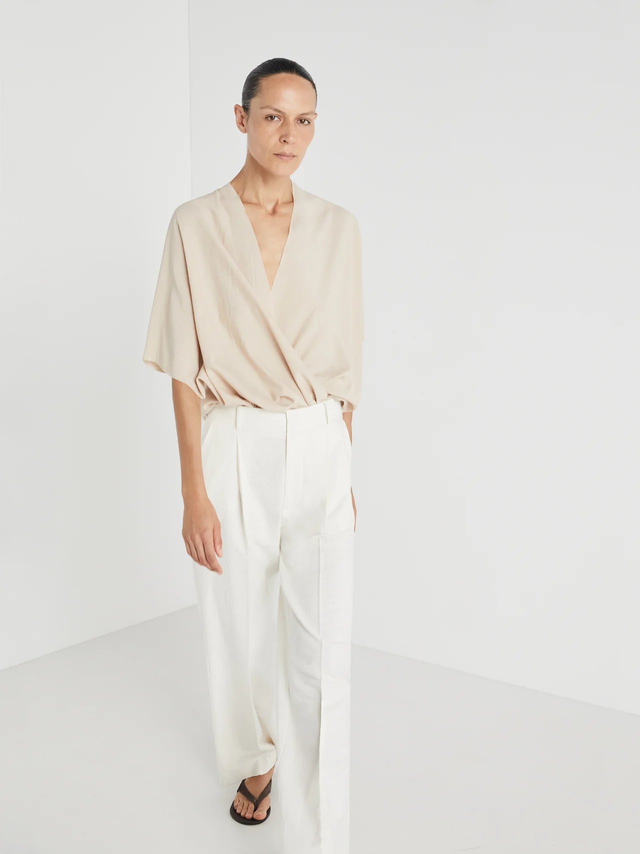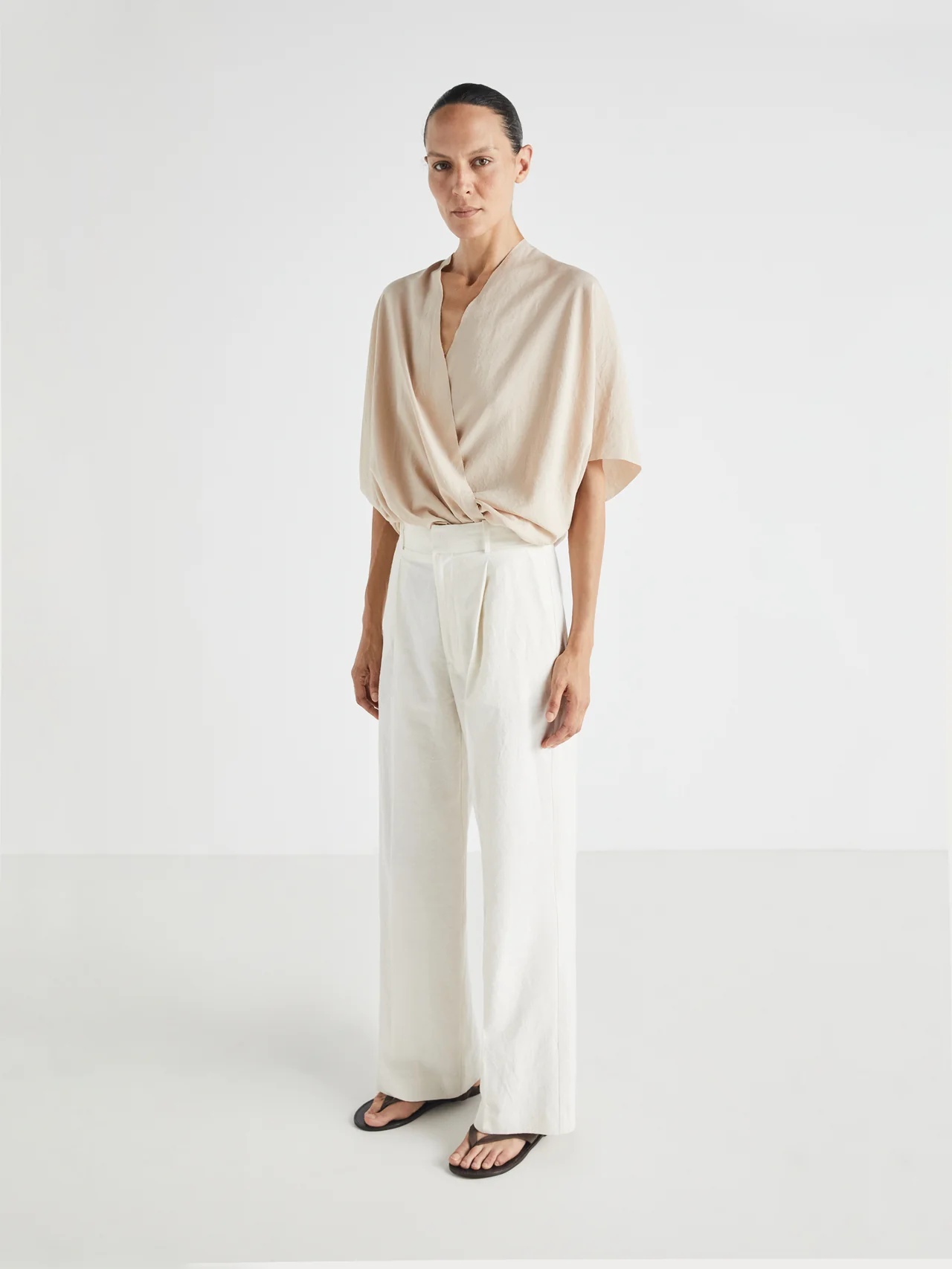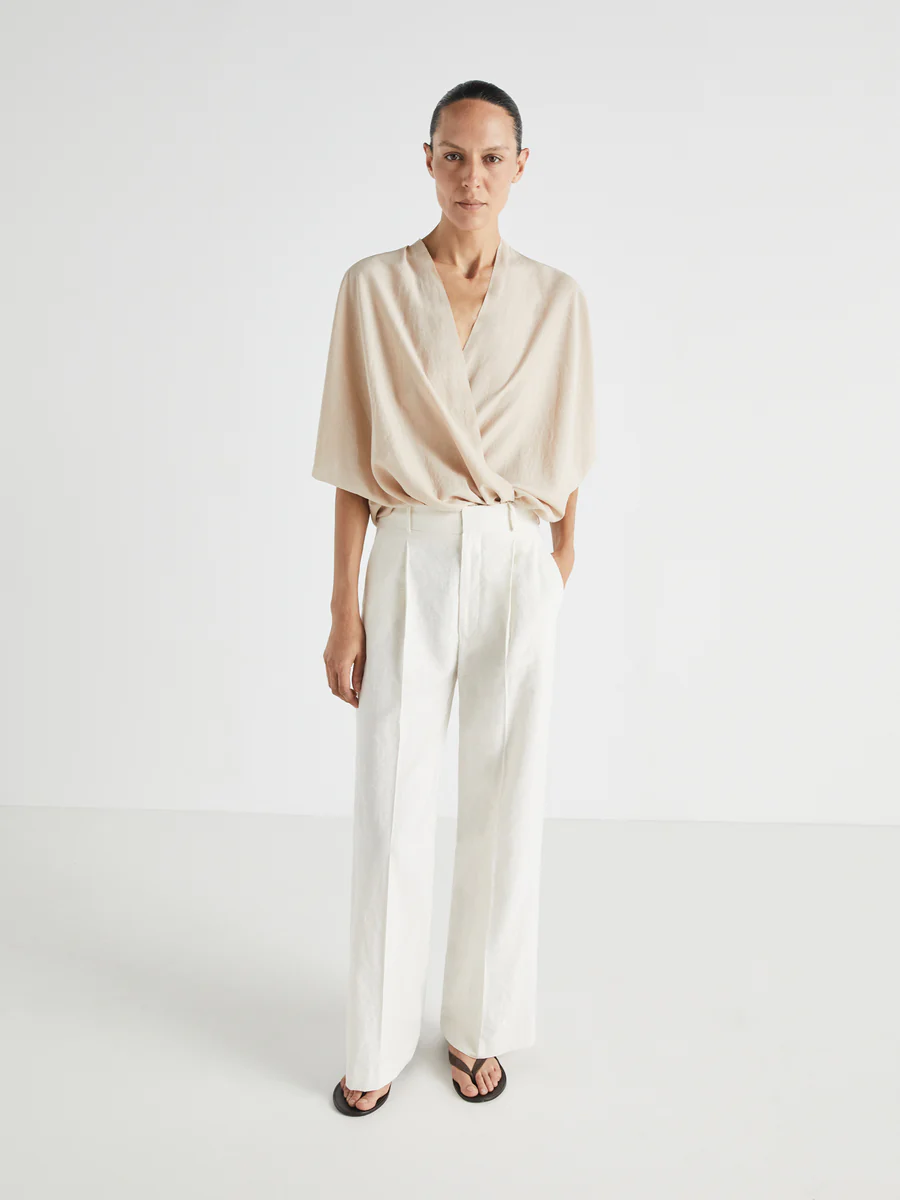 Pantalones de sastrería en una mezcla de algodón, seda y lino, color perlado.