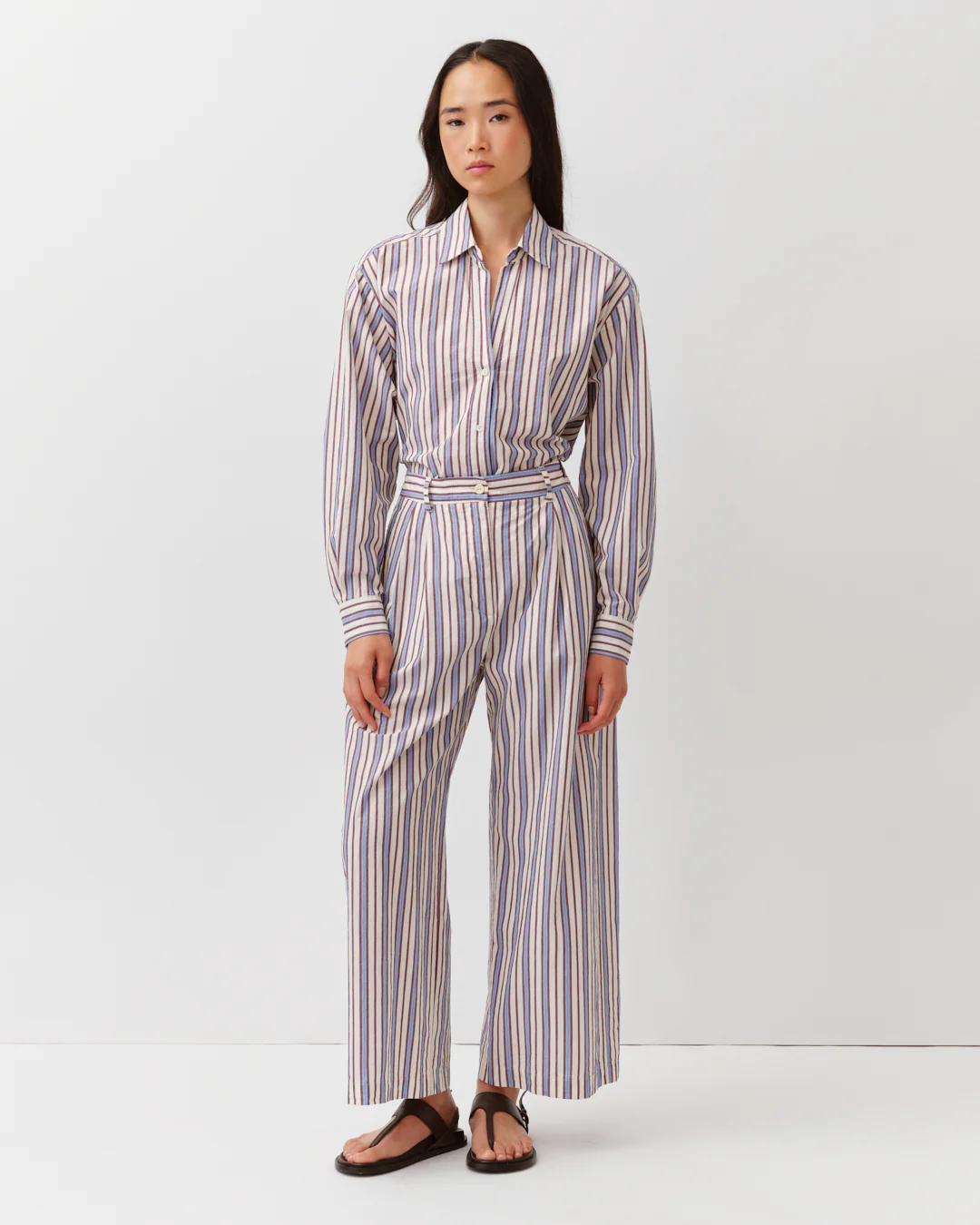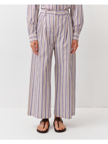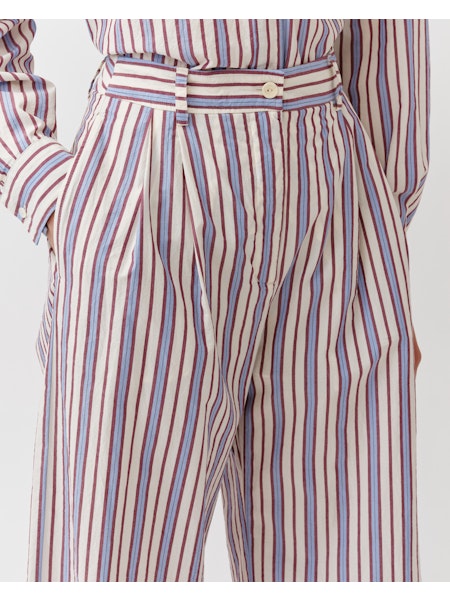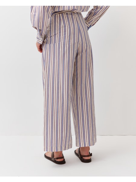 Pantalones de rayas, corte recto y pierna ligeramente ancha. Cuenta con trabillas para cinturón, cierre con botón y cremallera. Bolsillos laterales.