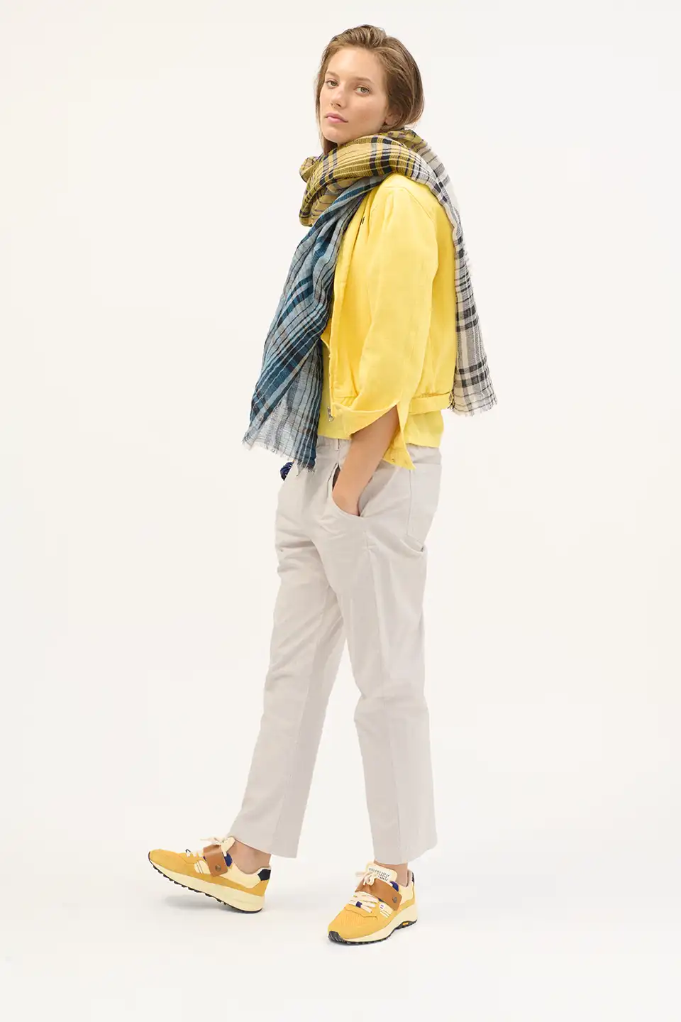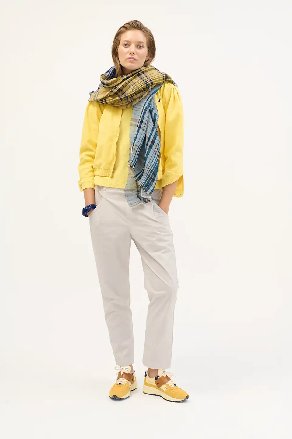 Fular con estampado de cuadros, confeccionado en 55% lino y 45% algodón.