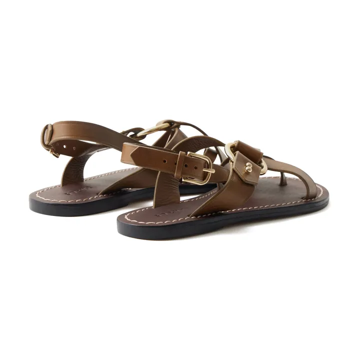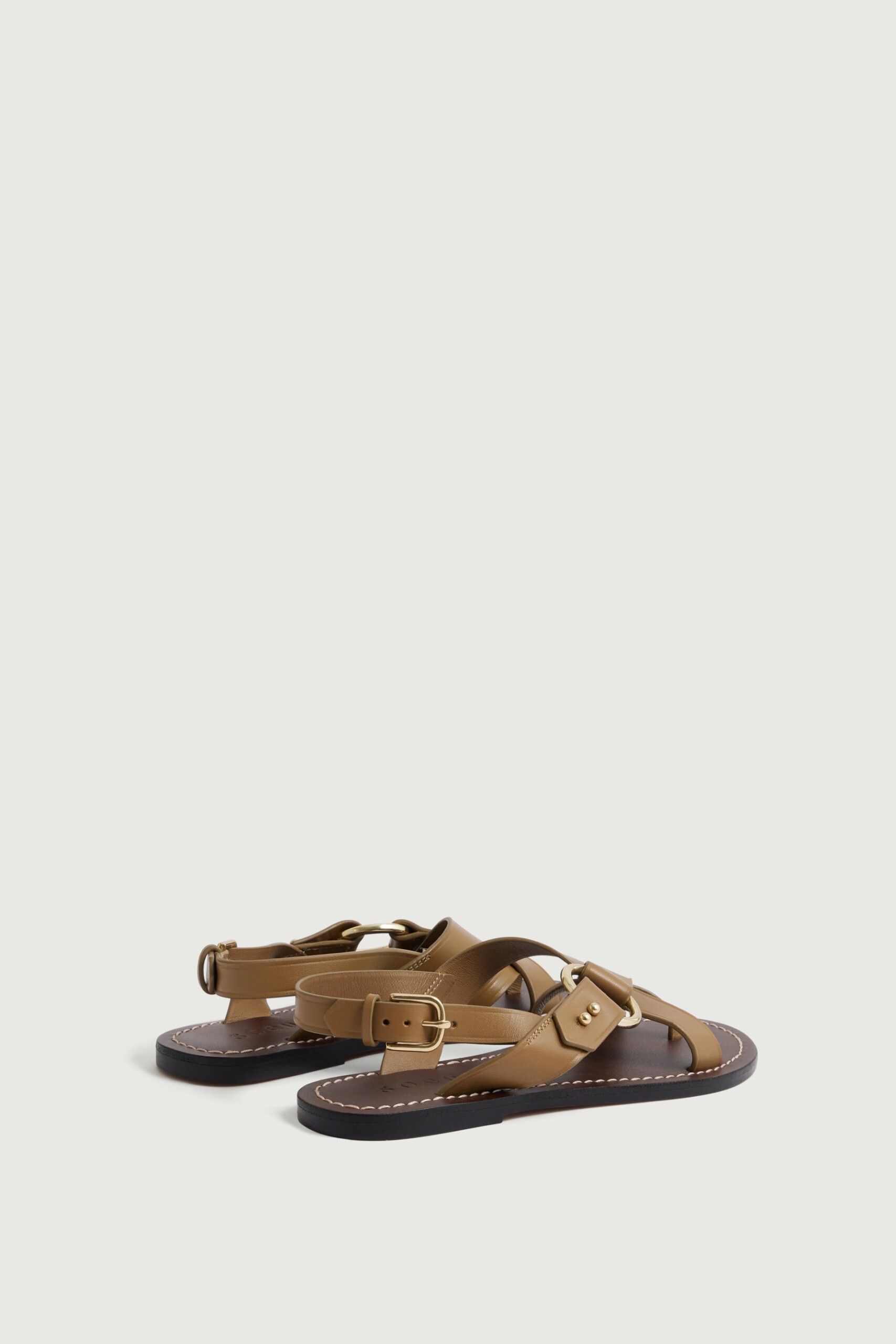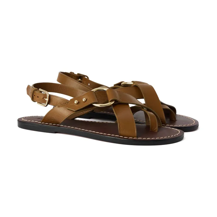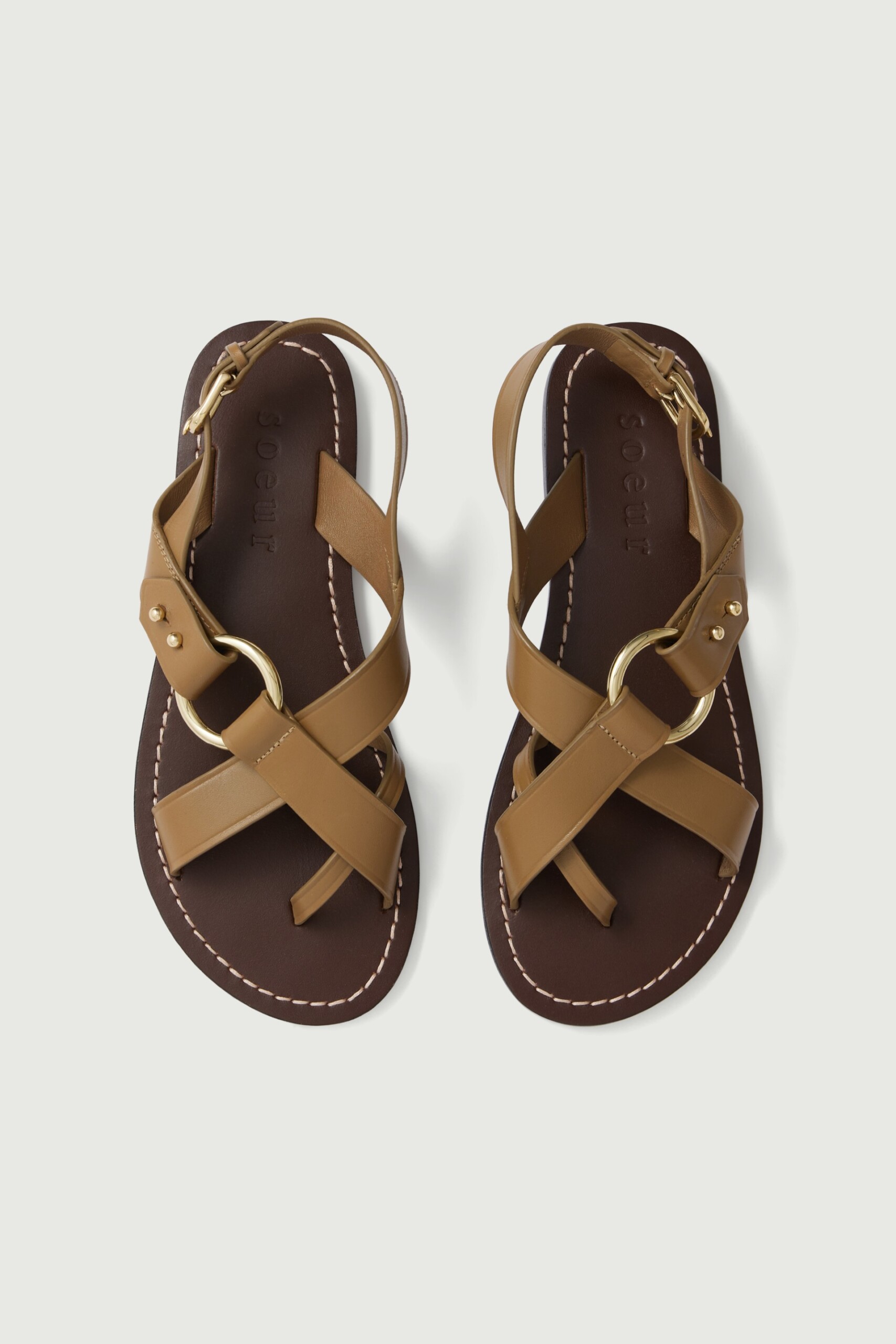 Sandalias planas de cuero. Las tiras cruzadas visten la parte delantera del pie y rodean el dedo gordo. La suela plana completamente pespunteada y el anillo dorado caracterizan esta sandalia icónica.