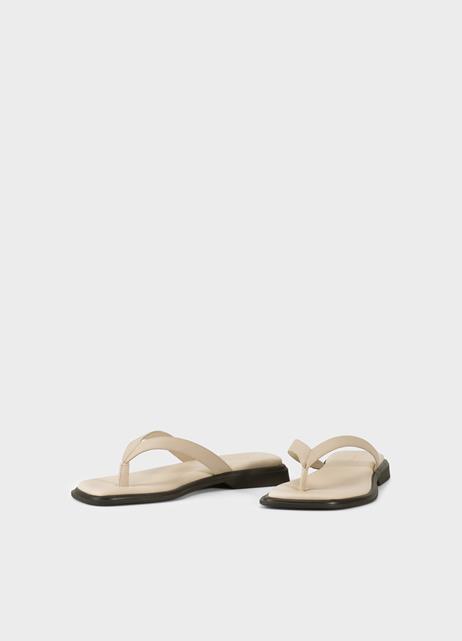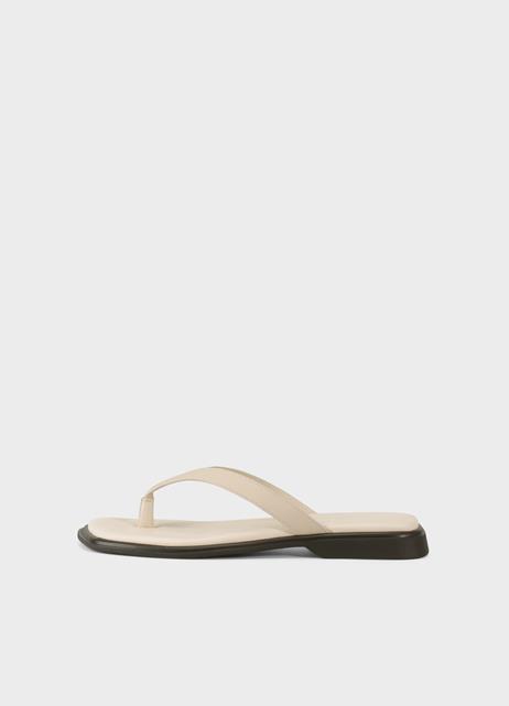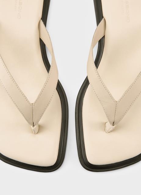 Sandalias de dedo, con un diseño estilizado, presenta una puntera cuadrada y está confeccionada en cuero de color blanco roto.
