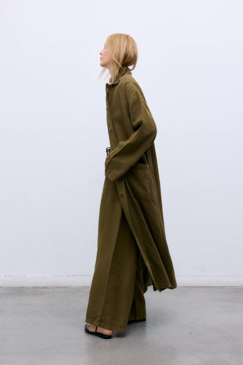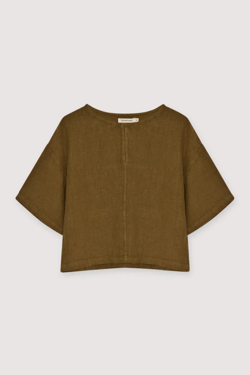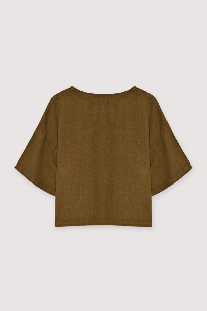Top de lino, con un corte holgado y relajado, que ofrece una sensación aireada y sin esfuerzo. Presenta un delicado corte frontal con detalle de cerradura y una abertura trasera con cierre de botón. Una pieza versátil, perfecta para combinar con otros estilos del mismo grupo para un look coordinado.
