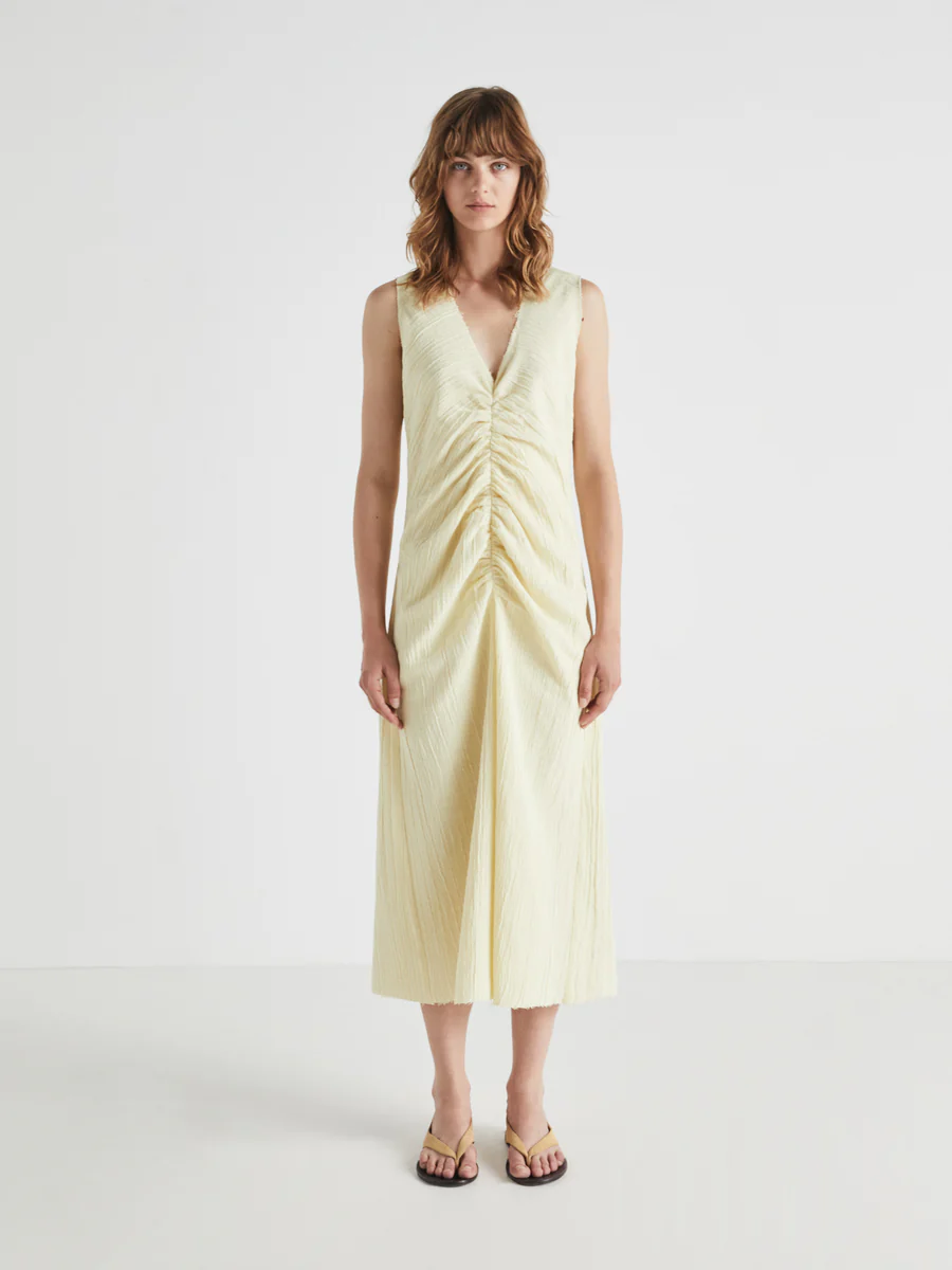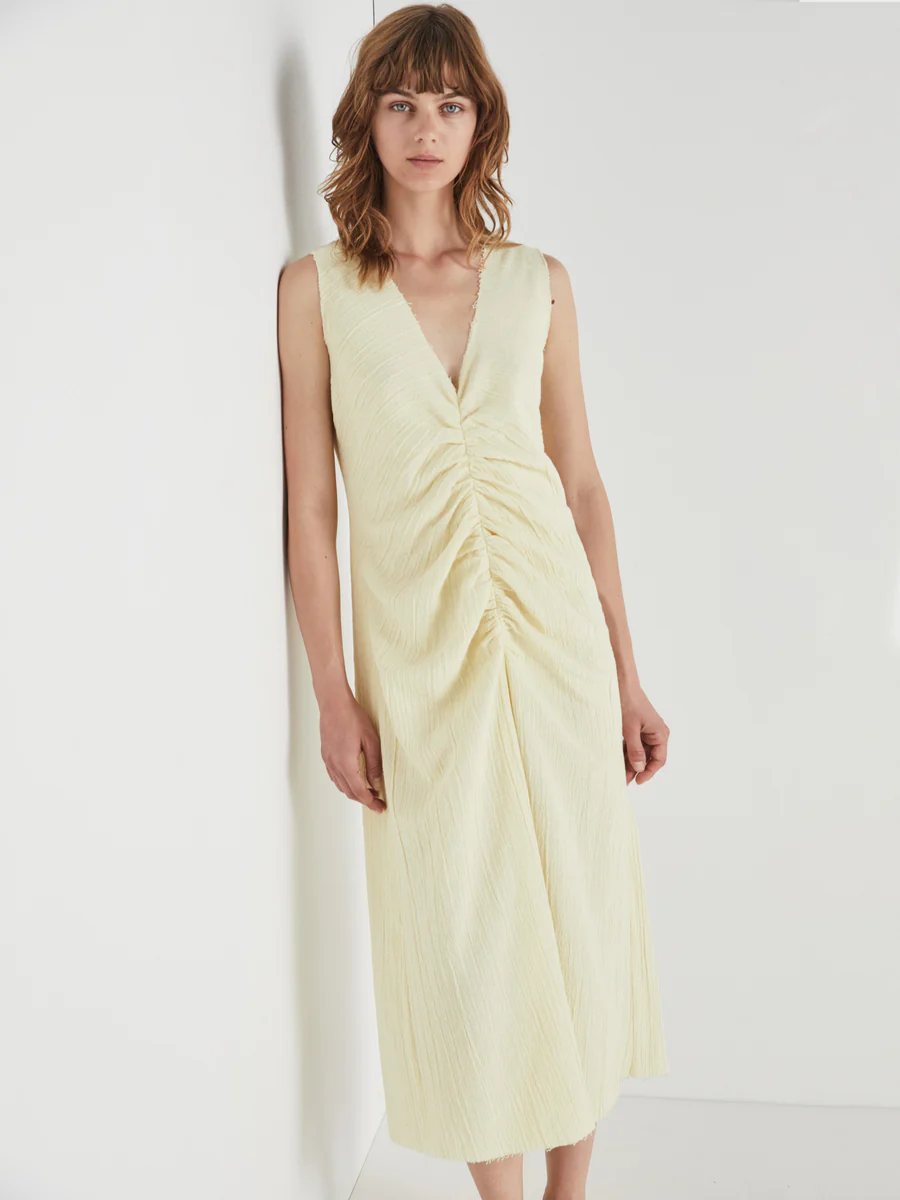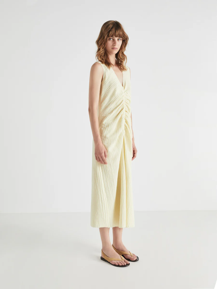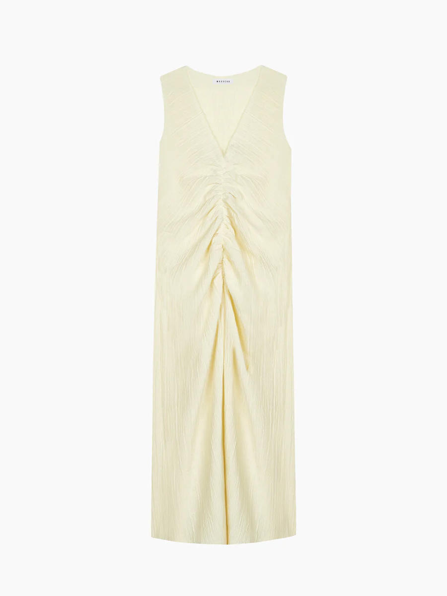 Vestido de largo midi, con escote en V, sin mangas. Detalle delantero fruncido. Ajuste regular, largo.