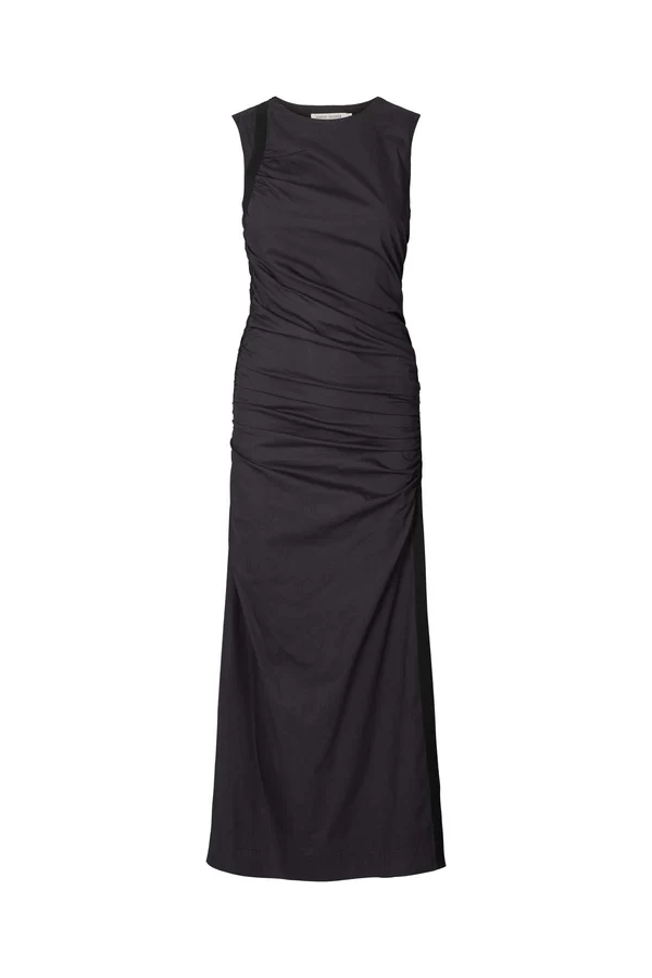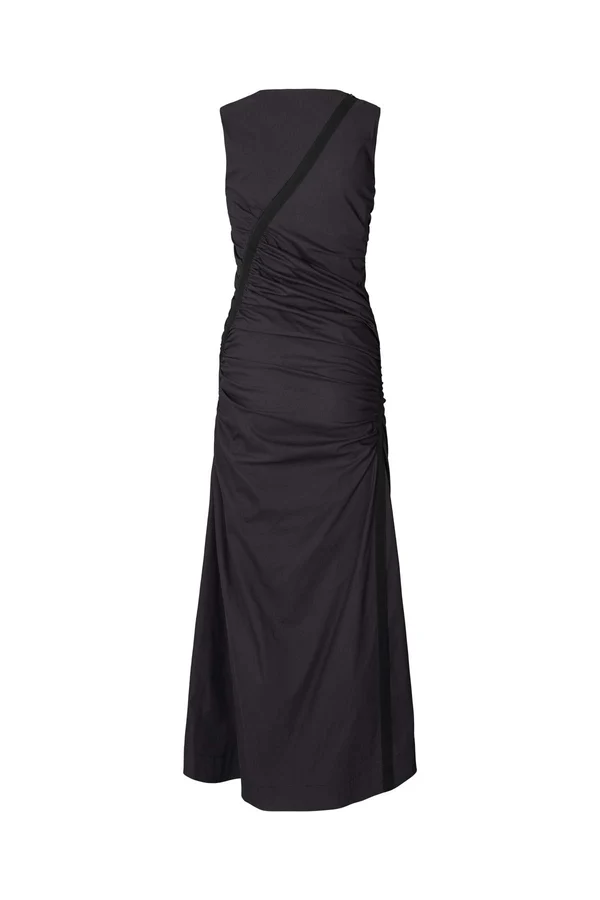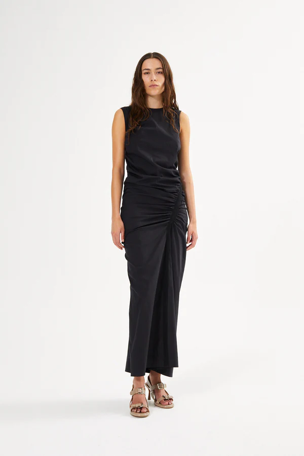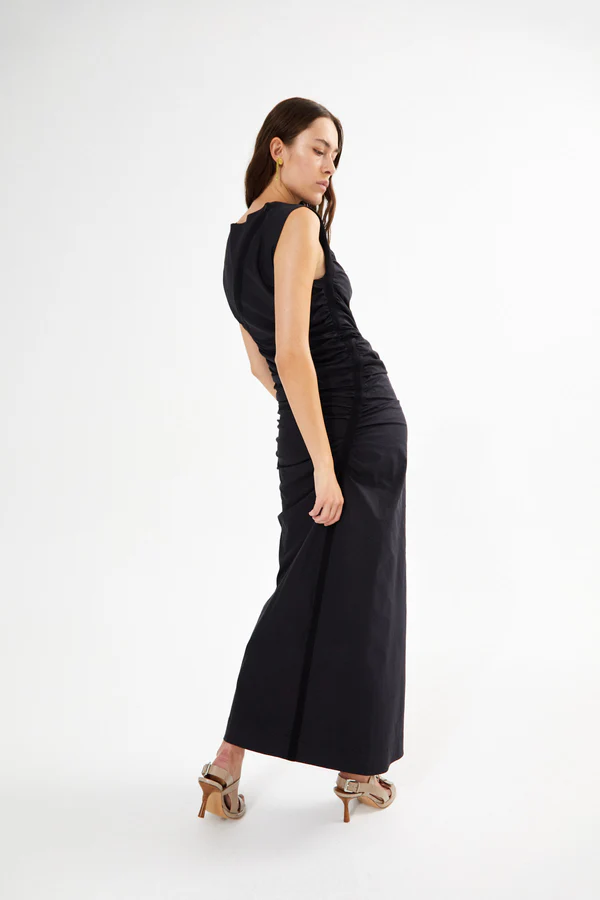 Vestido largo de color negro, ligero, con drapeado asimétrico, ceñido al cuerpo. Cierre con cremallera en espalda.