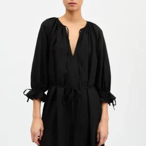 Vestido mini Laila, es un vestido corto, realizado en algodón con estampado de mini palmeras, manga acampanada y escote en pico, con lazos largos para atar, con detalle de borlas. El vestido está forrado para evitar transparencias.
