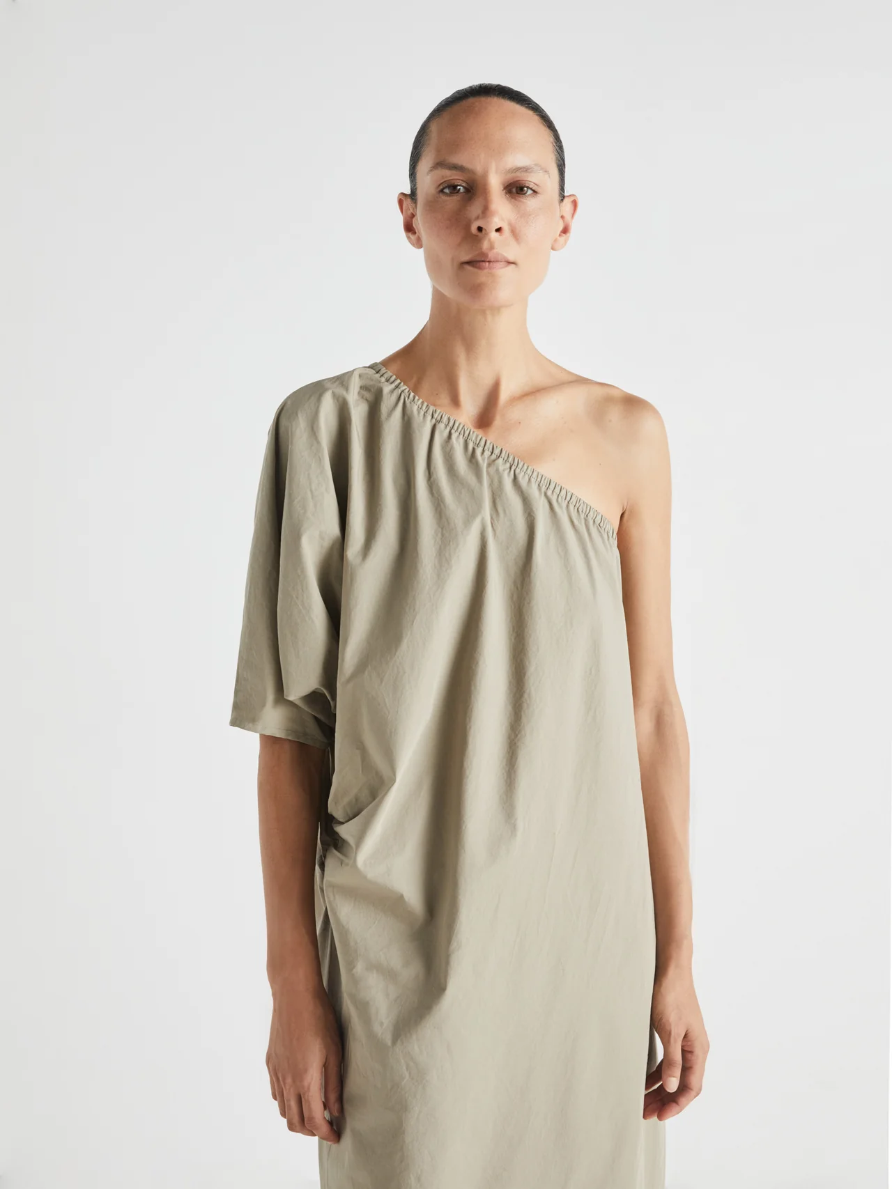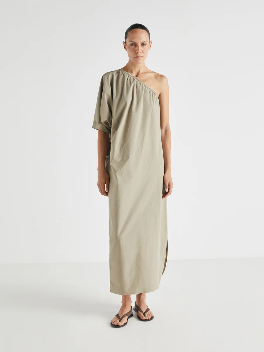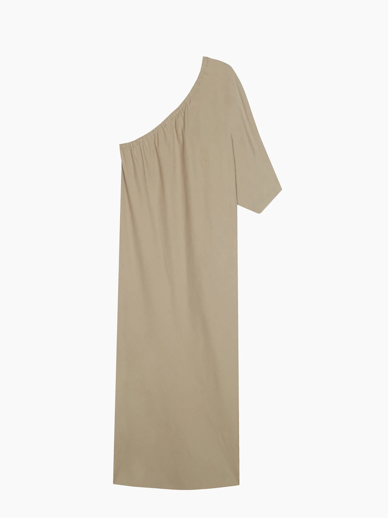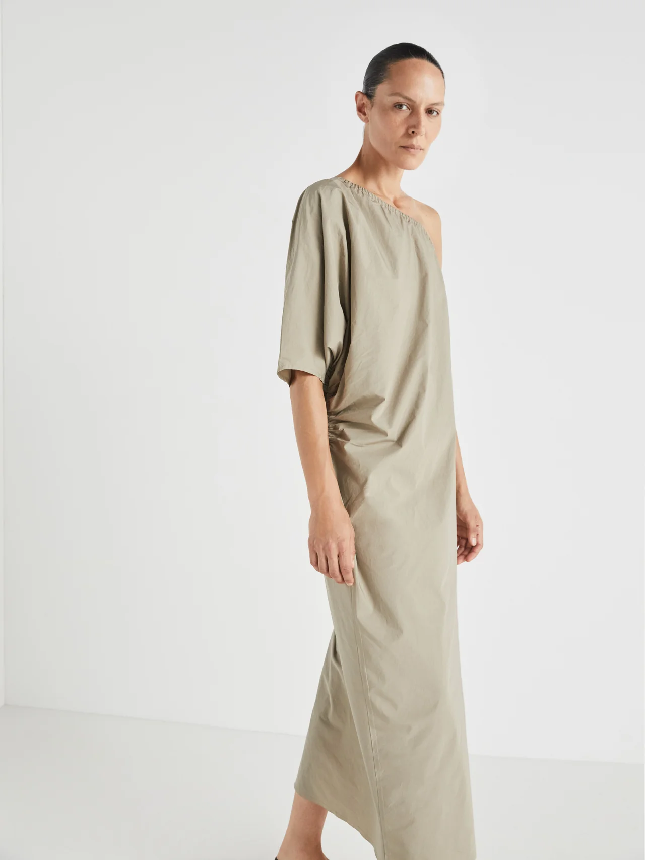 Vestido asimétrico en popelina de algodón. Escote elástico, manga 3/4, fruncido lateral.
